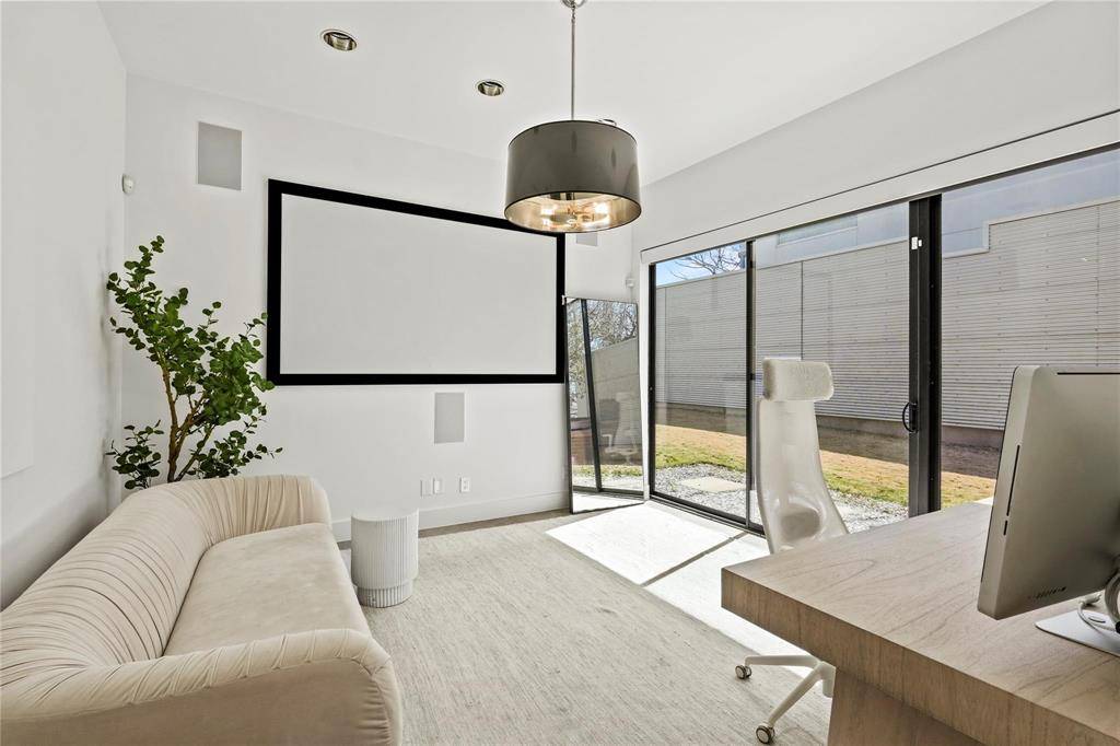 Designed by the award-winning architectural firm Bernbaum Magadini, this exceptional modernist residence is nestled within the architecturally acclaimed Urban Reserve community. Showcasing premium finishes and sophisticated design, the home is ideally positioned just moments from White Rock Creek Trail and Greenway. Upon entry, you're welcomed by soaring 14-foot ceilings, expansive floor-to-ceiling windows, and an open-concept layout that seamlessly balances contemporary style with everyday livability. Polished concrete floors, statement lighting, and a dramatic crushed-glass fireplace create a captivating ambiance throughout the main living area. The chef-inspired kitchen is both sleek and functional, featuring luxurious Carrera marble countertops, custom rift-cut white oak cabinetry, and high-end appliances, including a built-in warming drawer and espresso machine. The serene primary suite is a true retreat, offering dual vanities, a double walk-in shower, and a fully customized closet system. A private downstairs media room provides an ideal space for relaxation or entertainment, while high-efficiency windows flood the home with natural light and invite seamless indoor-outdoor living. This is a rare opportunity to own a distinctive, design-forward home in one of Dallas' most celebrated modern communities.