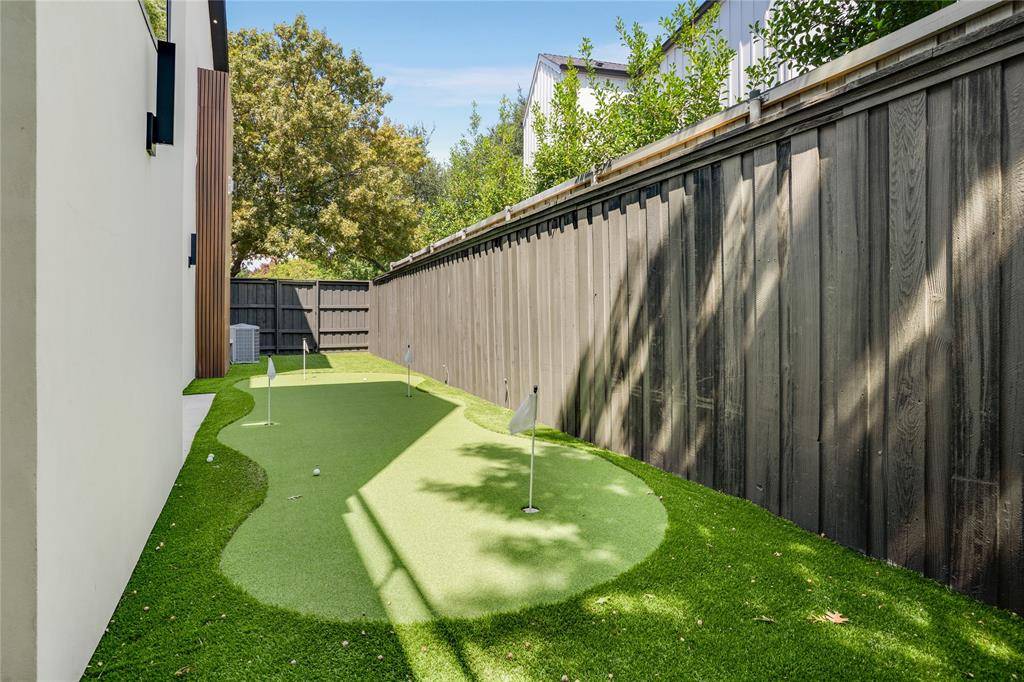 The first floor features a luxurious primary suite with dual walk-in closets, spa-inspired bath, and private outdoor access to a putting green and yard. Another generously-sized downstairs bedroom suite is perfect for guests or intergenerational living.