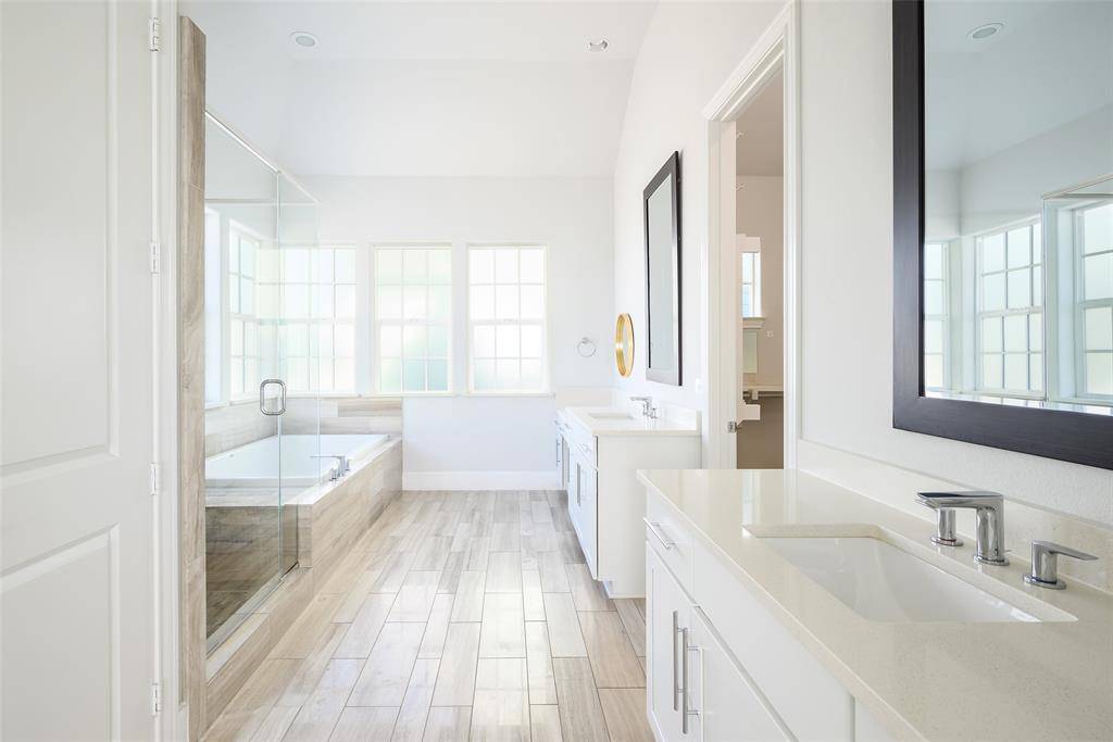 Upstairs, you'll find three well appointed bedrooms and a utility closet. Two secondary bedrooms share a full bath, while the large primary suite is flooded with natural light and offers a spa-like bathroom dual sinks, separate shower and bath and a custom closet system. The washer dryer can be negotiated with the sale of the home.