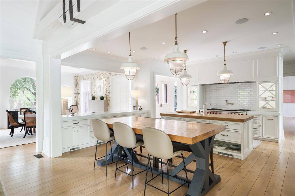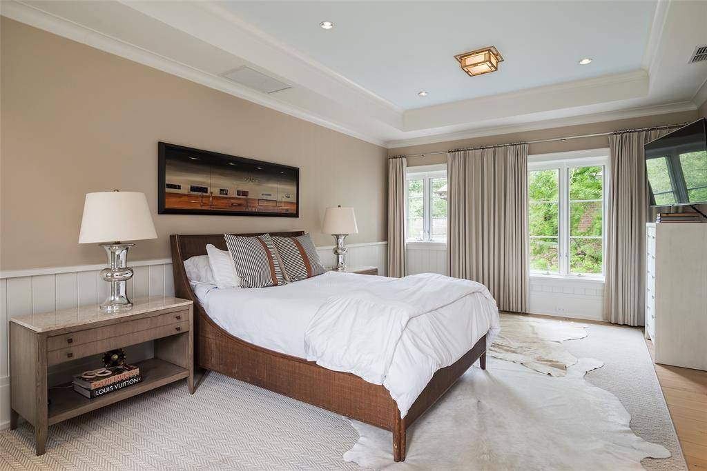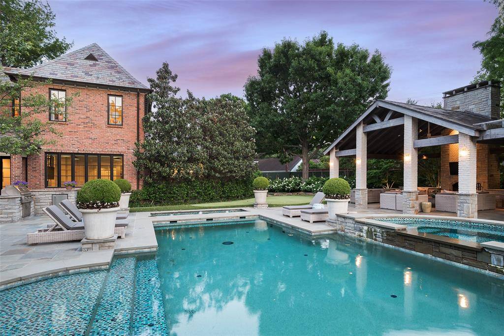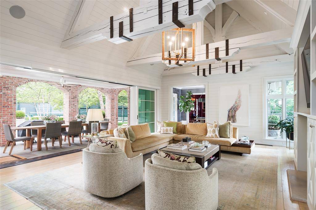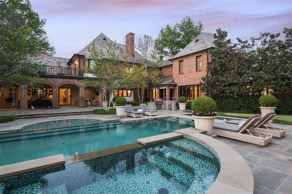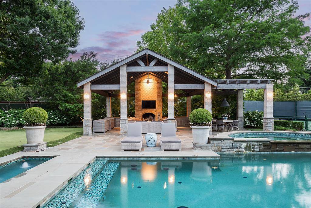 Set on an elevated 1.24-acre lot (where the original Murchison estate resided) within the ultra-private, gated and guarded community of Los Arboles, this Hamptons-inspired estate originally designed by Wilson Fuqua was completely transformed via a to-the-studs remodel circa 2017 by MORE Design + Build, by lead designer, Chad Dorsey, into a fresh vision of luxury. This exclusive enclave of just 31 estate homes is a hidden gem in Preston Hollow. With tree-lined streets, peaceful ponds, and a resort-like atmosphere, it's hard to believe you're only minutes from Dallas' top private schools, luxury shopping, and world-class dining. The thoughtful floor plan seamlessly blends modern amenities with comfortable living. Six primary-sized bedrooms and nine baths unfold across five distinct living areas. The open-concept kitchen and family room serve as the heart of the home, with custom cabinetry, an incredible separate prep area with pocket doors, and sliding glass doors that open completely to your backyard oasis. Multiple access points lead to private balconies and outdoor living areas blurring the line between indoors and out. On the main level, you'll find elevated designed spaces: a home office, media room, gym, and a moody speakeasy-style bar that is featured in Dorsey's recent book, Relaxed Luxury. Just above a private guest suite with private entrance and balcony offer privacy for long-term guests. Upstairs, the primary suite feels like a private escape with a serene balcony overlooking the pond, dual walk-in closets, and a marble-wrapped bathroom. Four additional unique oversized en suite bedrooms round out the thoughtfully designed second floor. Outdoor living areas boasts a covered pavilion with a fireplace, separate screened in patio, a regulation lighted tennis court, putting green, pool and spa. This property features a 4-car garage with port cochere and additional parking pads for one of the best off-street parking arrangements in the development.