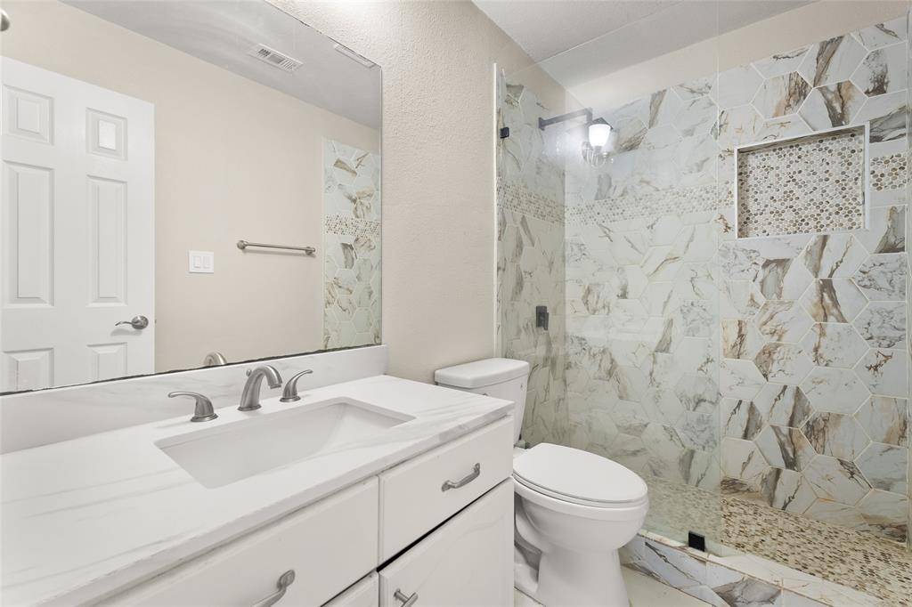 The spacious primary suite serves as a relaxing owner's retreat, featuring a long double vanity and a spa-inspired bathroom with a large walk-in shower designed for two, complete with dual shower heads, a rain shower feature, and built-in bench seating.