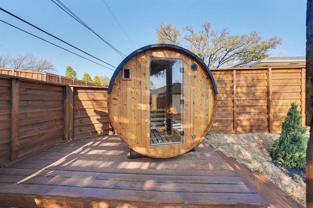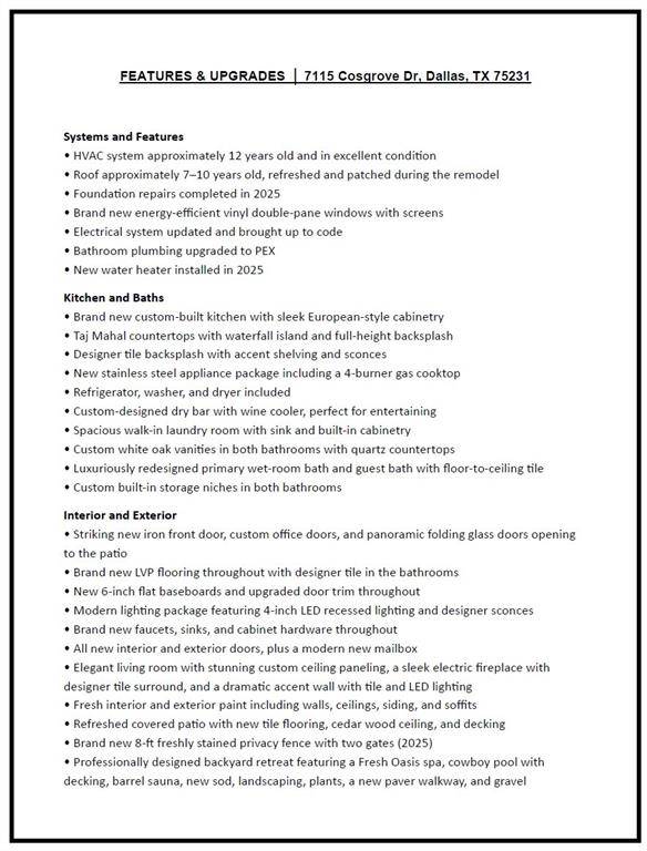 OPEN HOUSE, SATURDAY 2-4PM! Do not miss this one! Discover refined modern living in this STUNNING fully remodeled family home with a backyard oasis, located in the highly sought-after Merriman Park Estates. Completely reimagined by Together Design and Build, this 2,701 sq ft luxury residence sits on a 0.2-acre lot and blends sophisticated design with high-end craftsmanship. Featuring 4 beds, an office, 3 designer baths, and a 2-car garage, the home has been thoughtfully renovated with premium materials and upscale finishes throughout. From the moment you enter, you're welcomed by a bright open-concept layout filled with natural light from brand new energy-efficient windows. The show-stopping kitchen features custom white oak cabinetry, Taj Mahal quartz countertops, an impressive 89”×54” waterfall island, SS appliances, & a cozy breakfast nook that opens to a stylish laundry room featuring a custom green cabinetry and ample storage. A stylish dry bar with wine cooler adds the perfect touch for entertaining. The elegant living room boasts custom ceiling paneling, a sleek electric fireplace with designer tile surround, and a dramatic accent wall with tile and LED lighting. The primary suite offers 2 walk-in closets and a spa-inspired wet-room with a standalone tub and floor-to-ceiling tile rainfall shower. 2 additional bedrooms share a sleek Jack-and-Jill bath, while the 4th bedroom features its own private bath, ideal for guests. Premium LVP flooring runs throughout, with elegant tile in the baths, complemented by designer lighting throughout. Step outside through the 96”x80” bi-fold patio doors to your own backyard oasis featuring a 4-person barrel sauna, cowboy pool, a custom-built deck, and a new 8-foot stained fence - perfect for relaxing or entertaining. Located minutes from White Rock Lake trails, the Dallas Arboretum, Lakewood, Town Center, Lower Greenville, with easy access to major highways, dining, shopping, and entertainment. Come see it before it's gone!