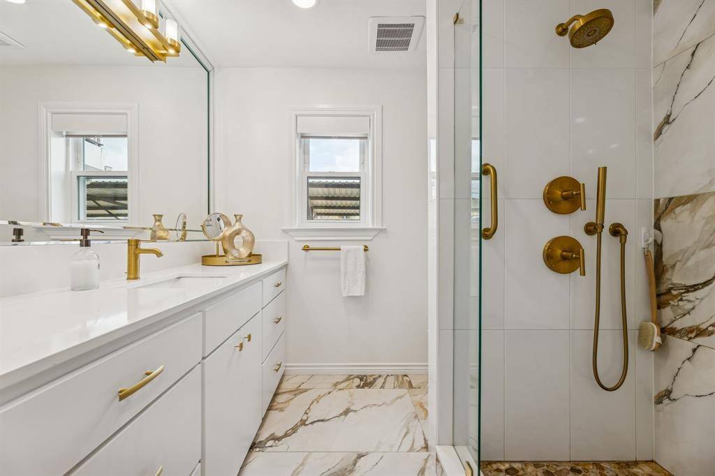 The primary suite offers a spa-inspired bath featuring Grohe fixtures, a custom tile shower with rain and pulsating massage heads, handheld wand, and designer lighting. The hall bath includes a whirlpool tub, custom countertops, and upscale fixtures.