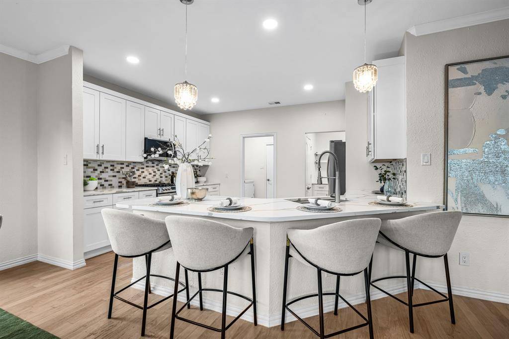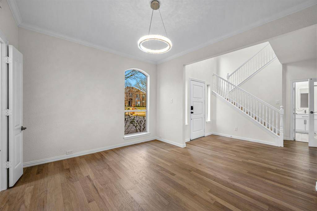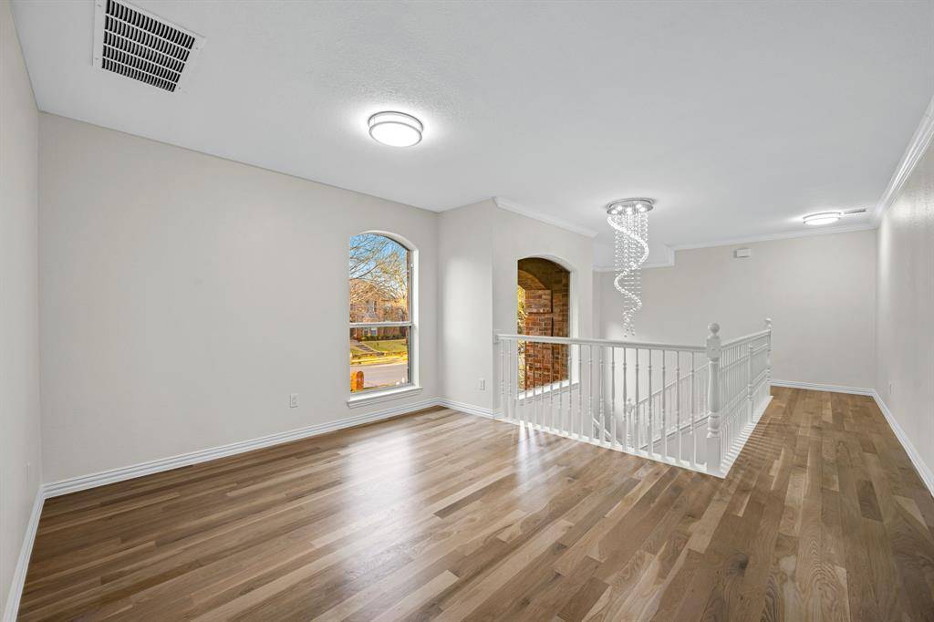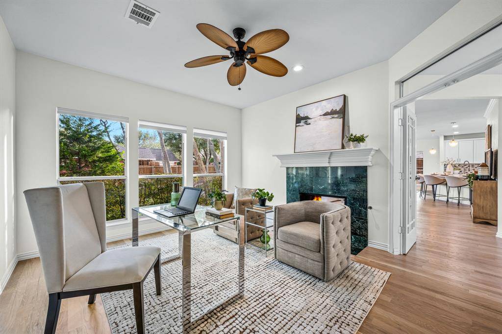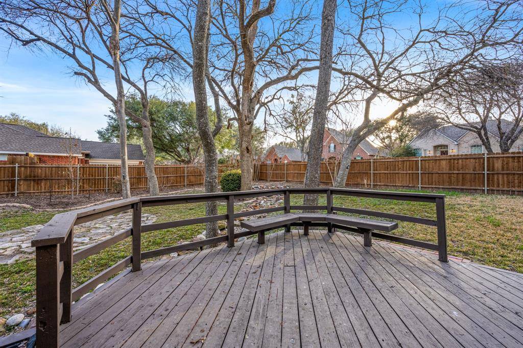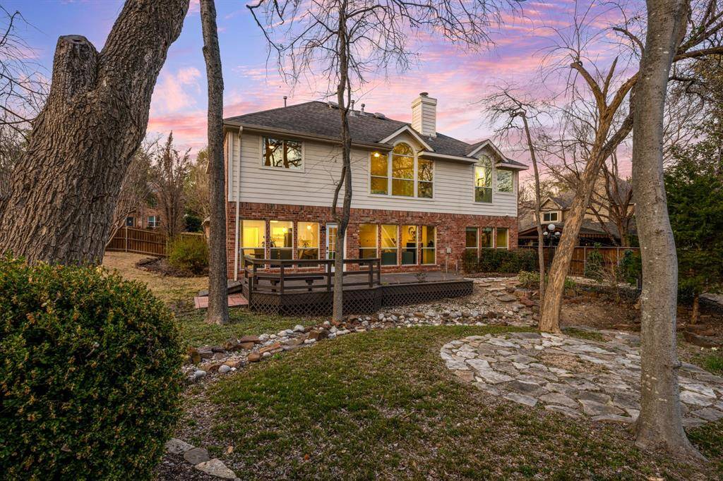 Come see this beautifully updated north-facing 3-bedroom, 2.5-bath, two-story home on a premium corner lot in highly desirable Watters Crossing in Allen. One of the largest lots in the neighborhood, this home offers exceptional outdoor space and an unbeatable location within walking distance to Watters Creek Village, scenic mile-long walk and bike trails along Watters Creek, and quick access to U.S. Route 75 and Sam Rayburn Tollway for an easy commute. The welcoming entry opens to a light-filled floor plan featuring updated lighting, warm wood flooring, and a seamless flow designed for everyday living and entertaining. The gourmet kitchen shines with quartz countertops, stainless steel appliances, and a breakfast bar that opens to the dining and living areas — perfect for gatherings. The main level includes a bright living room with large windows and a cozy see-through fireplace shared with a private office or flex space. Upstairs, you'll find three spacious bedrooms, including a relaxing primary suite with a beautifully updated en-suite bath featuring dual vanities, a soaking tub, frameless glass shower, and a large walk-in closet. Enjoy brand-new hardwood floors throughout the upstairs and flex space — with no carpet anywhere in the home — offering a clean, modern, and low-maintenance lifestyle. Step outside to a wonderful deck overlooking the expansive private backyard, complete with a fire pit area, gazebo, and landscaped dry creek bed, creating the perfect setting for entertaining or relaxing. Community amenities include two pools, with one just a short two-minute walk away. Move-in ready and perfectly located, this home offers comfort, style, and convenience all in one.