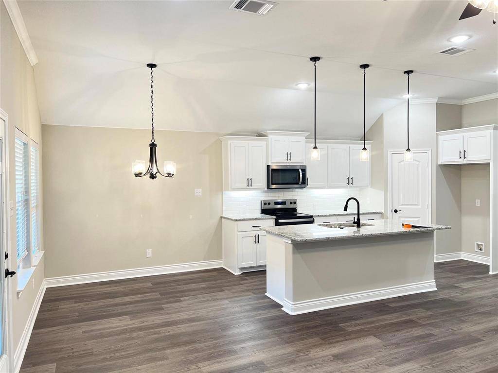 Welcome to your dream home in Stonewood Estates! This new build by Scott Ellis Homes features 3 bedrooms, 2 bathrooms, and a 2-car garage. Enjoy beautiful wood vinyl flooring, a spacious kitchen with granite countertops and a large island, and an open floor plan with 10-foot ceilings. The master suite includes dual sinks, a separate shower and tub, and a frameless shower. Additional features include crown molding, ceiling fans, and a covered back patio. Located just 5 minutes from L3-Harris, I-30, local restaurants, and shopping, this home offers style, comfort, and convenience. Don't miss out!