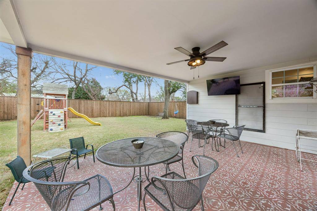 Enjoy outdoor living on the spacious covered patio overlooking a large backyard with lush Zoysia grass and a cedar board-on-board privacy fence—perfect for entertaining, pets, gardening, or play.