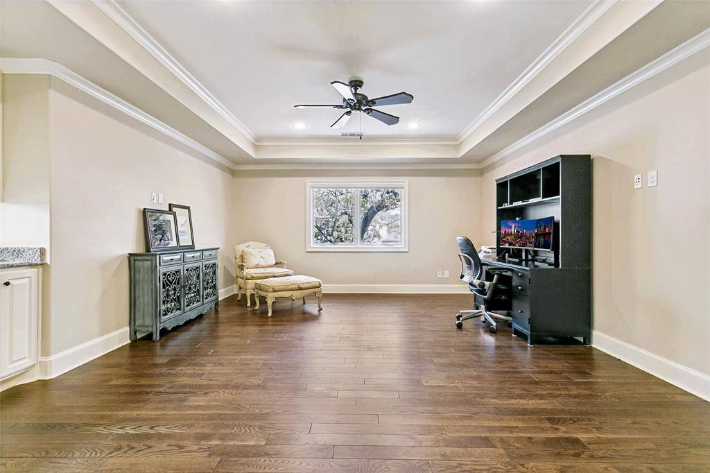Alexander Hunt custom home gracefully positioned on an oversized corner lot and wrapped in a timeless Austin stone exterior. A circular drive creates a grand arrival, leading to the three-car garage with a dedicated workshop, ideal for hobbies, projects, or additional storage.