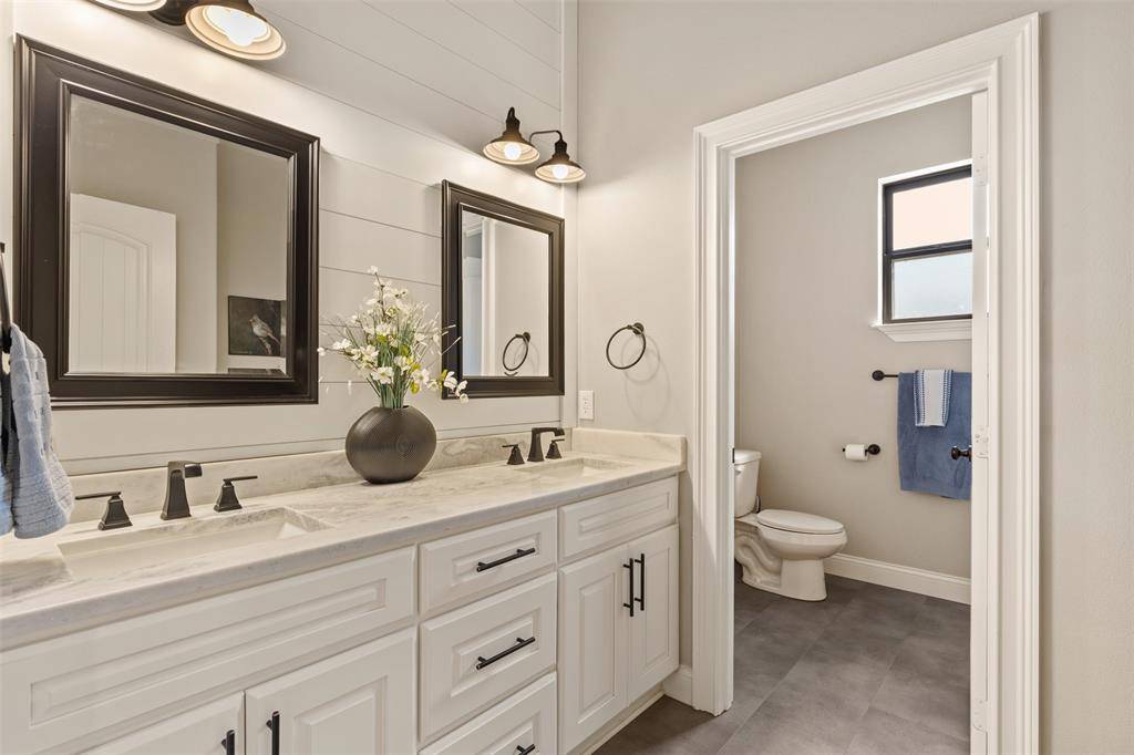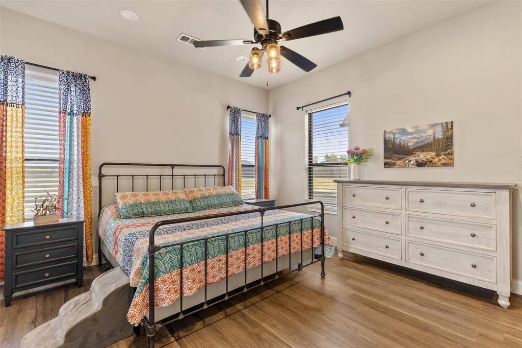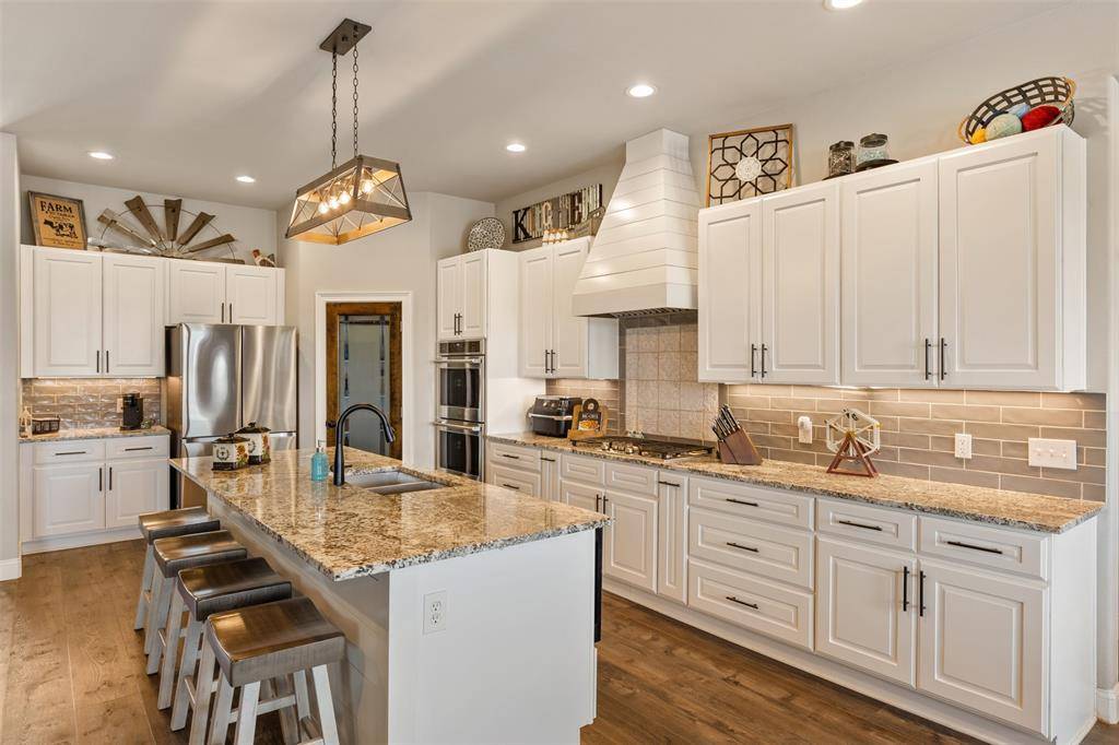 Welcome to your private retreat on 1.613 acres, where modern luxury meets wide open Texas living. This beautifully designed 3,005 square foot home offers 4 bedrooms, 3.5 bathrooms, a dedicated office, and a flexible upstairs suite perfect for guests, additional living space, or even a second primary bedroom. Step inside to an expansive open concept layout where the living, dining, and kitchen areas flow seamlessly together. Rich LVP flooring, abundant natural light, and a stunning stone fireplace create a warm and inviting atmosphere. The chef inspired kitchen features granite countertops, an oversized island, gas cooktop, double ovens, and a spacious walk in pantry, making it ideal for both everyday living and entertaining. The private primary suite is tucked away and offers a spa like bathroom with a walk in shower, soaking tub, dual vanities, and direct access to the laundry room through the oversized walk in closet. The split bedroom design provides added privacy for family and guests. Step outside and enjoy resort style living with a covered patio overlooking a heated pool and spa, surrounded by beautiful landscaping and wide open space. The fully fenced property also includes a full size batting cage with turf, creating a unique outdoor experience. The impressive 1,200 square foot shop is equipped with electricity and water and includes a 20 by 16 insulated media room with dedicated heating and cooling, along with full network and TV wiring. If you have been searching for space, style, and functionality all in one exceptional property, this is the one. Schedule your showing today!