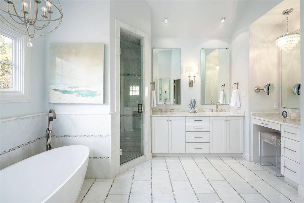 Behind a gracious façade, the home itself reveals a refined transitional renovation by Kerry Ketner, where timeless architecture meets modernized interiors. With a dedicated office and 5 generous bedrooms with en-suite baths, it offers comfort and seclusion for family and guests. A series of elegant living spaces and a formal dining room flow effortlessly into an open kitchen and breakfast area designed for daily living as much as gracious entertaining. Expansive windows frame the verdant grounds and draw natural light throughout the interiors, while the home's orientation toward the adjacent parcel creates a seamless visual and spatial dialogue between indoor living and the extraordinary grounds beyond.