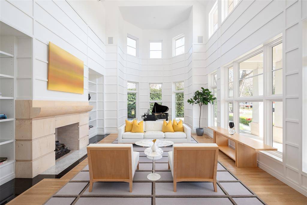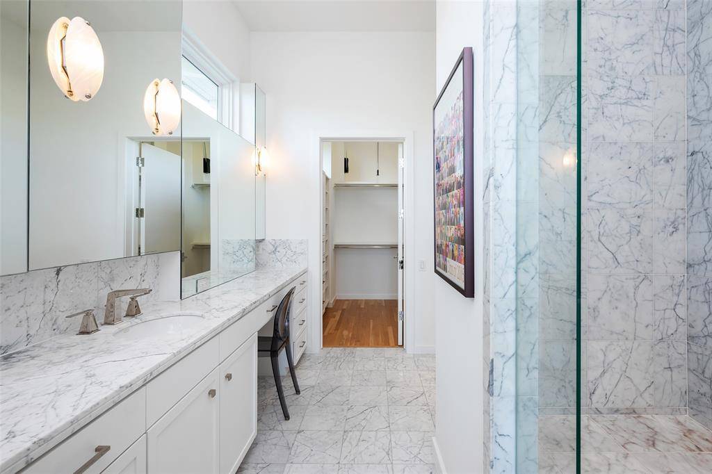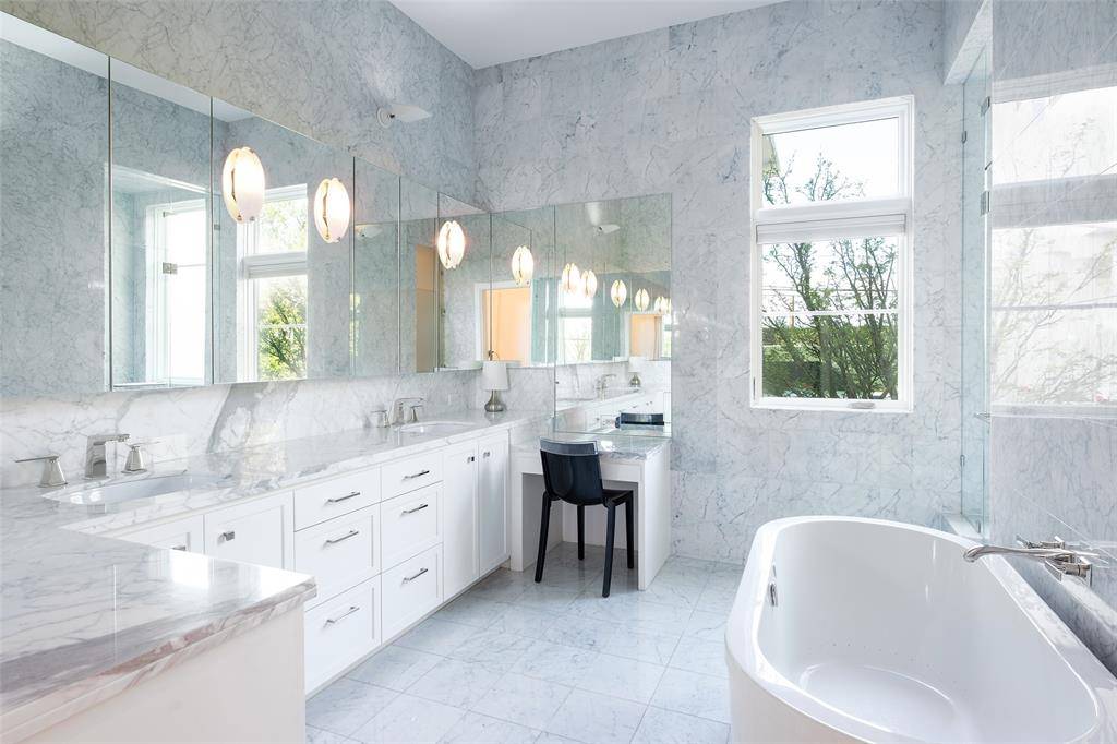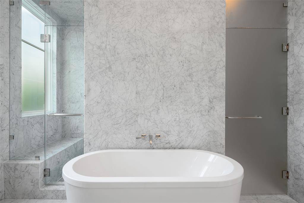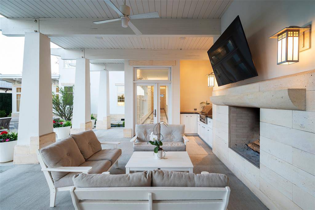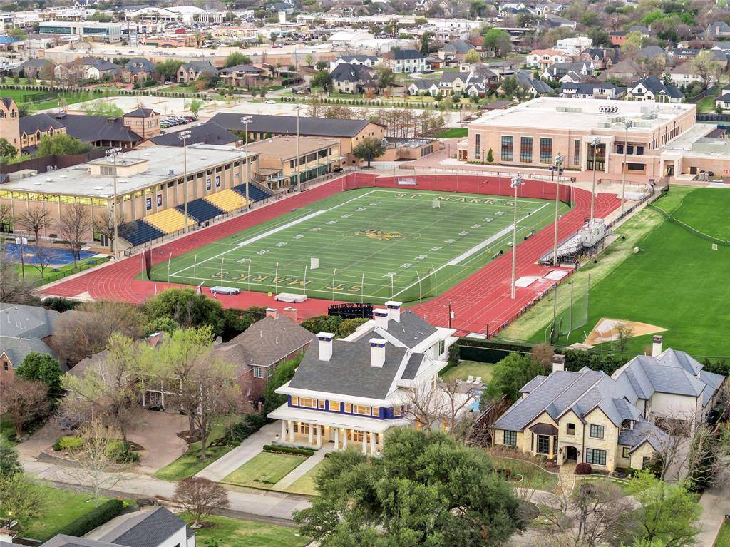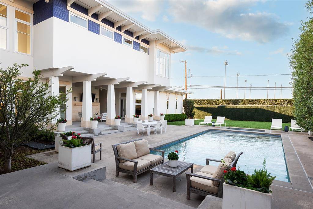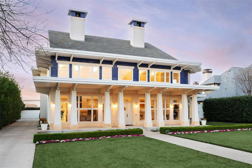 This innovative interpretation of the classic Craftsman home at 6215 Norway carries an air of the resort lifestyle of the Hamptons or Seaside, Florida. Chosen for the AIA Dallas Home Tour in 2023, it is one of only a handful of homes with a private access gate to the St. Mark's campus. The convenience and privacy this location offers are truly exceptional. Designed by architect Michael Malone and built by Manning Snelling, the 6,886 square foot, 5 bedroom, 6.1 bathroom residence is set on an extra-deep 100 x 200 lot. Malone drew inspiration from C.F.A. Voysey, and Frank Lloyd Wright to create this timeless look. Thick tapered columns, and the large gabled front porch, create an immediate sense of invitation. A blue frieze line of tile at the top of the offers a memorable design element. An environmentally sound home, each major interior space has a corresponding exterior area, allowing for a continuous flow of light. A uniform set of finishes, including Carrera marble and white oak floors, is used throughout the house. Traditional and modern elements are beautifully balanced. Classic open living and dining rooms offer a unique twist, a grid pattern as a unifying design motif. The decorative grid paneling continues in the two-story family room, where a butler's pantry and a wine room are tucked behind the open-plan kitchen. The primary wing ceiling extends the grid pattern in a streamlined industrial touch, with French doors opening to the pool. The principal bathroom is wrapped in marble with a large shower and a vessel tub. Upstairs are four generously sized ensuite bedrooms – two that offer incredible panoramic views onto St. Mark's campus. A playroom and exercise room complete the upstairs. With 1,200 square feet of outdoor living space, featuring a covered patio with a fireplace and grill station, a large grassy area, and a pool and spa, this is an ideal environment for both daily living and entertaining. A 3-car garage with room for lifts completes the home.