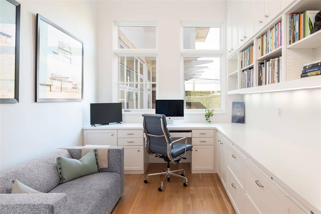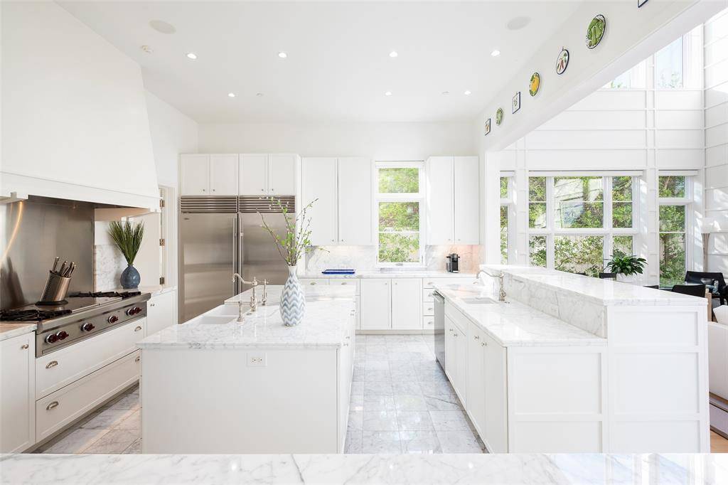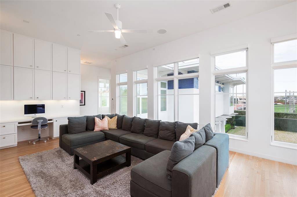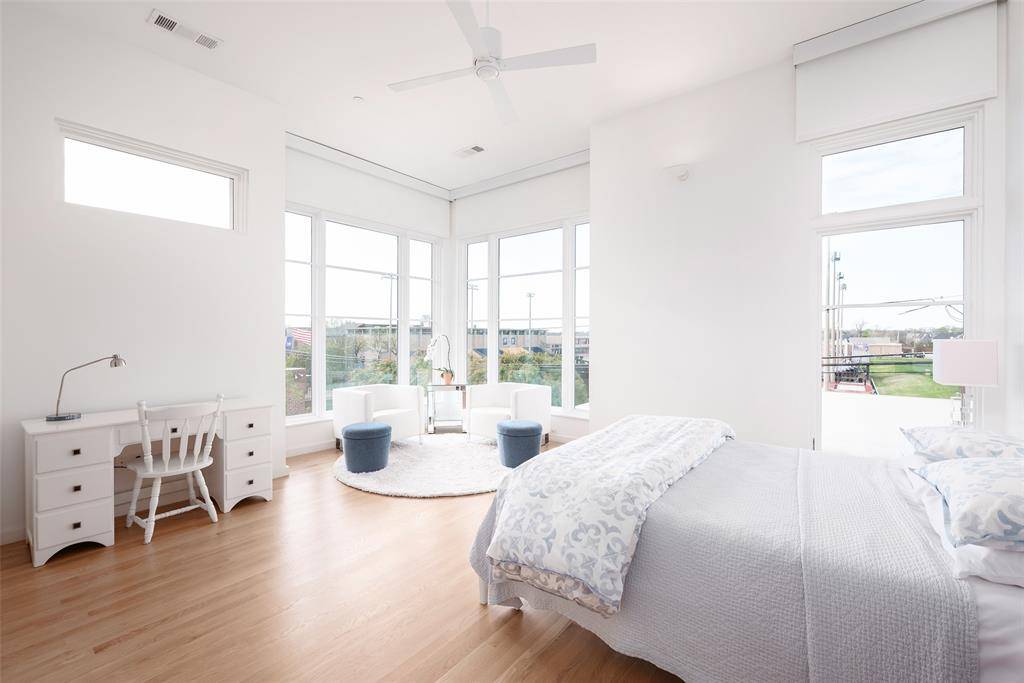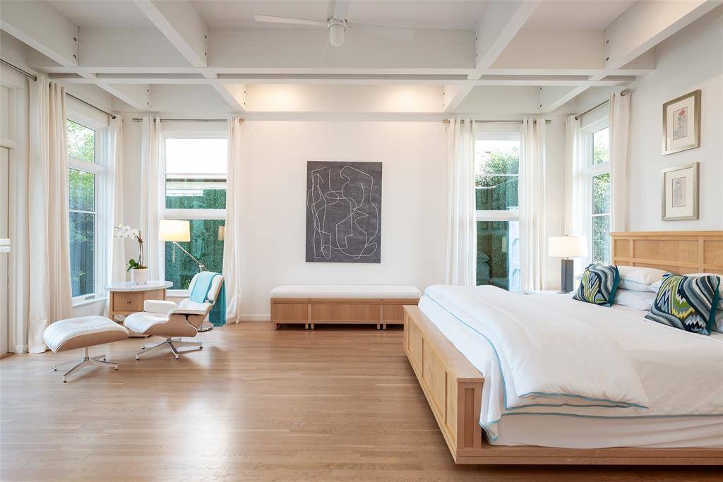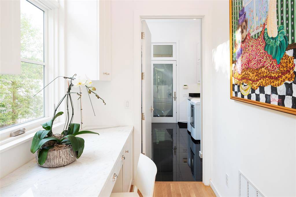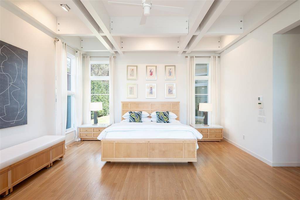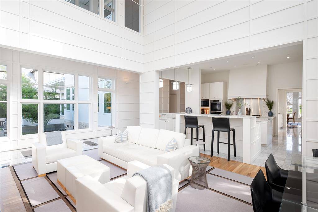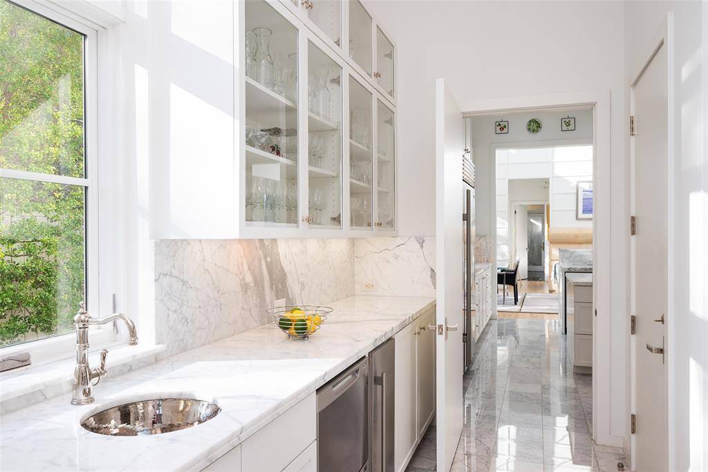 This innovative interpretation of the classic Craftsman home at 6215 Norway carries an air of the resort lifestyle of the Hamptons or Seaside, Florida. Chosen for the AIA Dallas Home Tour in 2023, it is one of only a handful of homes with a private access gate to the St. Mark's campus. The convenience and privacy this location offers are truly exceptional. Designed by architect Michael Malone and built by Manning Snelling, the 6,886 square foot, 5 bedroom, 6.1 bathroom residence is set on an extra-deep 100 x 200 lot. Malone drew inspiration from C.F.A. Voysey, and Frank Lloyd Wright to create this timeless look. Thick tapered columns, and the large gabled front porch, create an immediate sense of invitation. A blue frieze line of tile at the top of the offers a memorable design element. An environmentally sound home, each major interior space has a corresponding exterior area, allowing for a continuous flow of light. A uniform set of finishes, including Carrera marble and white oak floors, is used throughout the house. Traditional and modern elements are beautifully balanced. Classic open living and dining rooms offer a unique twist, a grid pattern as a unifying design motif. The decorative grid paneling continues in the two-story family room, where a butler's pantry and a wine room are tucked behind the open-plan kitchen. The primary wing ceiling extends the grid pattern in a streamlined industrial touch, with French doors opening to the pool. The principal bathroom is wrapped in marble with a large shower and a vessel tub. Upstairs are four generously sized ensuite bedrooms – two that offer incredible panoramic views onto St. Mark's campus. A playroom and exercise room complete the upstairs. With 1,200 square feet of outdoor living space, featuring a covered patio with a fireplace and grill station, a large grassy area, and a pool and spa, this is an ideal environment for both daily living and entertaining. A 3-car garage with room for lifts completes the home.
