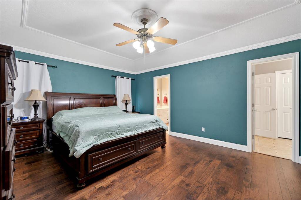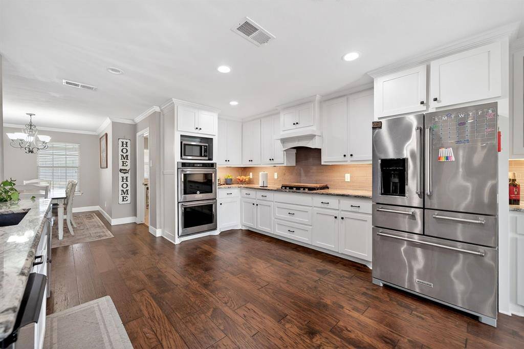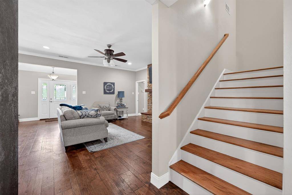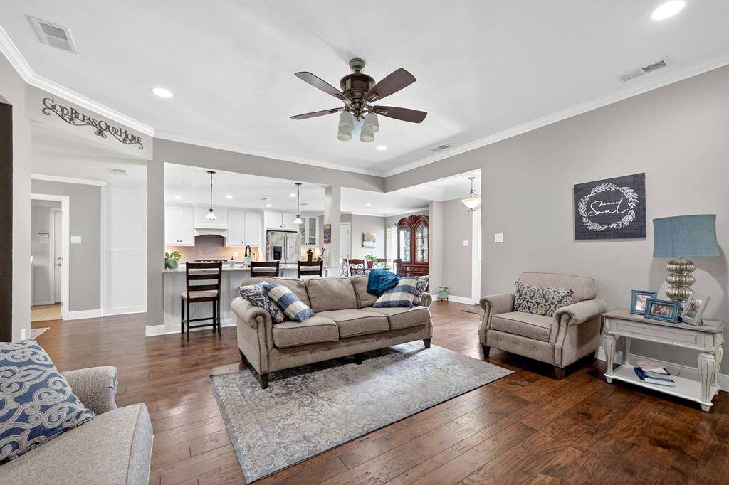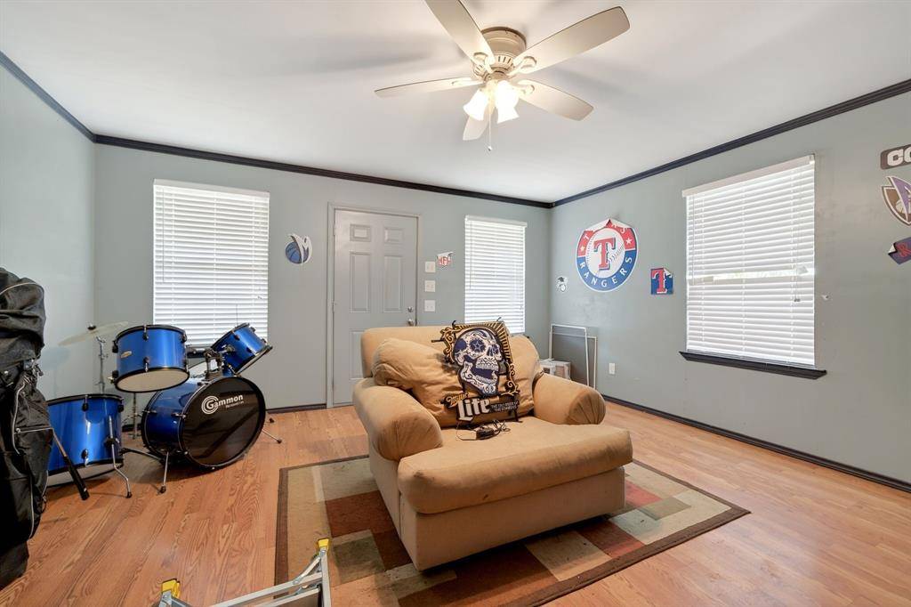 Situated on just over half an acre, this 3,300+ sq ft 5 bedroom, 3.5 bathroom home on a corner lot delivers space, flexibility, and privacy that's hard to find. Step into a welcoming living room filled with natural light, featuring hardwood floors, crown molding, thoughtful built-ins, and a striking fireplace, with a second oversized living area offering even more room to gather. The remodeled kitchen is built for everyday living and entertaining with granite counters, a large island with prep sink, double KitchenAid convection ovens, gas cooktop, ice maker, abundant cabinetry, and seamless flow into both the breakfast area and formal dining. The primary bedroom is spacious with tray ceilings, dual closets, and an ensuite bath featuring a garden tub, separate shower, and oversized vanity. Secondary bedrooms are generously sized with built-ins, plus upstairs bedrooms and baths create a functional layout for larger households. This beautiful, light-filled home offers a luxurious feel throughout and is designed to comfortably host and entertain large gatherings. Out back, enjoy a true retreat with a large covered outdoor living space, bar and cooking area, a 28,000 gallon free-form diving pool with waterfalls, fire pit, and exceptional privacy backing to open land. A separate structure with balcony overlooking the pool provides incredible flexibility, with a workshop below and bonus space above ideal for a home office, game room, or private retreat. New fence installed in 2024 and roof updated in 2024. Refrigerator, washer, dryer, and televisions are negotiable. Located in Greenville with convenient access to shopping, dining, and commuting routes, this property offers space to live, entertain, and grow. For your convenience, 2 washer connections, 2 dryer connections along with plenty of storage in the spacious laundry area. Proudly Claim Your Piece of Texas!
