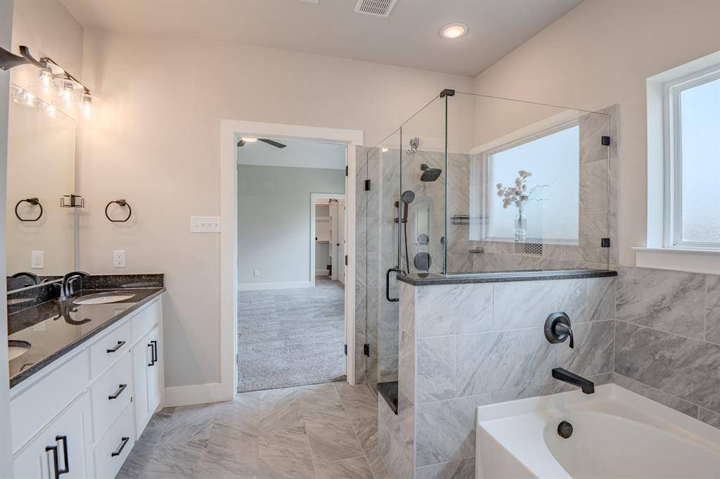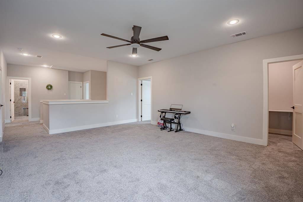 Built with upgraded full spray foam insulation, the home delivers enhanced energy efficiency, long-term savings, and a quieter, more comfortable interior environment. Inside, the flexible floor plan includes two suites on the main level, with the primary suite and a secondary bedroom featuring a full bath—ideal for multi-generational living or guests. A convenient half bath is also located on the main floor. The primary suite is a true retreat, complete with dual walk-in closets with built-in shelving and a private office space. The kitchen is well-appointed with a farmhouse sink, upgraded lighting, and a newer microwave, flowing seamlessly into the main living area, which features an upgraded ceiling fan and inviting gathering space. Newer carpet throughout enhances the home's fresh, move-in-ready feel. Upstairs offers a spacious bonus room, additional flex space, and an upgraded bathroom with a separate tub and shower. All bedrooms include walk-in closets, and the attic is floored for additional storage.