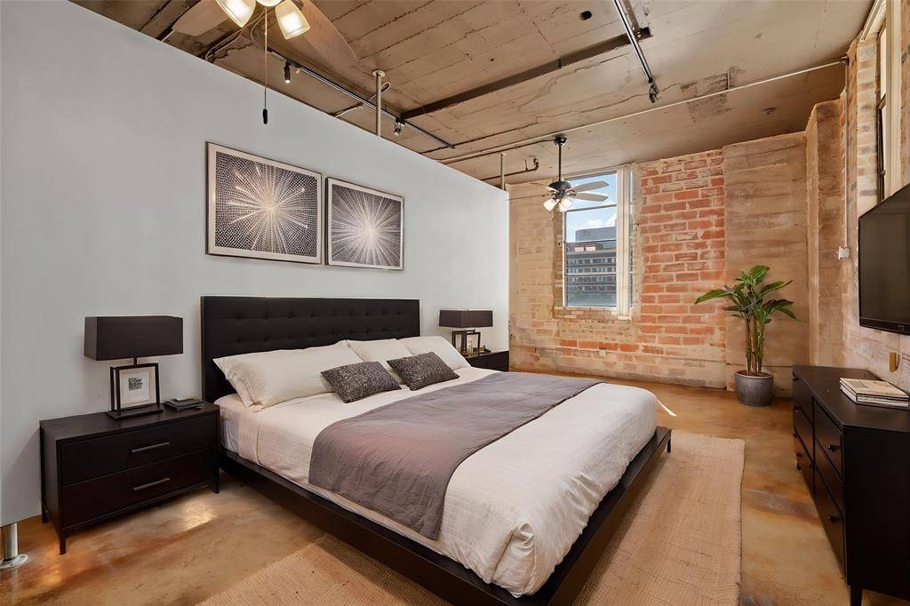 Discover this stylish and move-in-ready 1-bedroom, 1-bathroom condo, perfectly situated in the vibrant heart of Downtown Dallas. Spanning a generous 1,420 square feet, this bright and open residence offers a sophisticated urban retreat with soaring ceilings, striking exposed brick walls, and floor-to-ceiling windows that frame breathtaking panoramic views of the iconic Reunion Tower and the sleek Omni Hotel. As you step inside, the expansive living area invites you to relax in a cozy seating space while enjoying ever-changing views of the glittering Dallas skyline right from your living room. A distinctive room divider adds both architectural interest and versatility, easily transforming the space into a personal workout zone, home office, or additional sleeping area as needed. Residents enjoy exceptional building amenities, including 24-hour security, a sparkling rooftop pool on the 11th floor with an inviting outdoor seating area and grill, and a fully equipped gym located on the second floor. Two separate parking spaces are included with the unit. Once yours, you can request tandem parking if desired. This prime location places you within easy walking distance of the AT&T Discovery District and The Exchange, offering effortless access to world-class dining, entertainment, shopping, and cultural attractions. The HOA fee even covers high-speed internet, water, trash, and sewer services for added convenience. Ready to experience downtown Dallas living at its best? This beautiful condo is waiting for you.