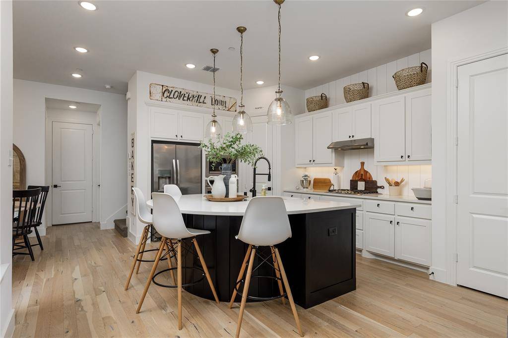 The chef-inspired kitchen is a true focal point, featuring upgraded appliances, crisp white cabinetry, quartz countertops, and a striking white shiplap backsplash. Designed for gathering, the kitchen opens effortlessly to the main living and dining areas, making it perfect for hosting or enjoying quiet evenings at home.
