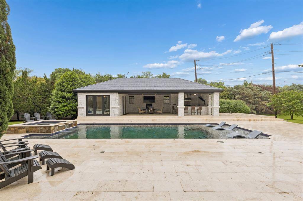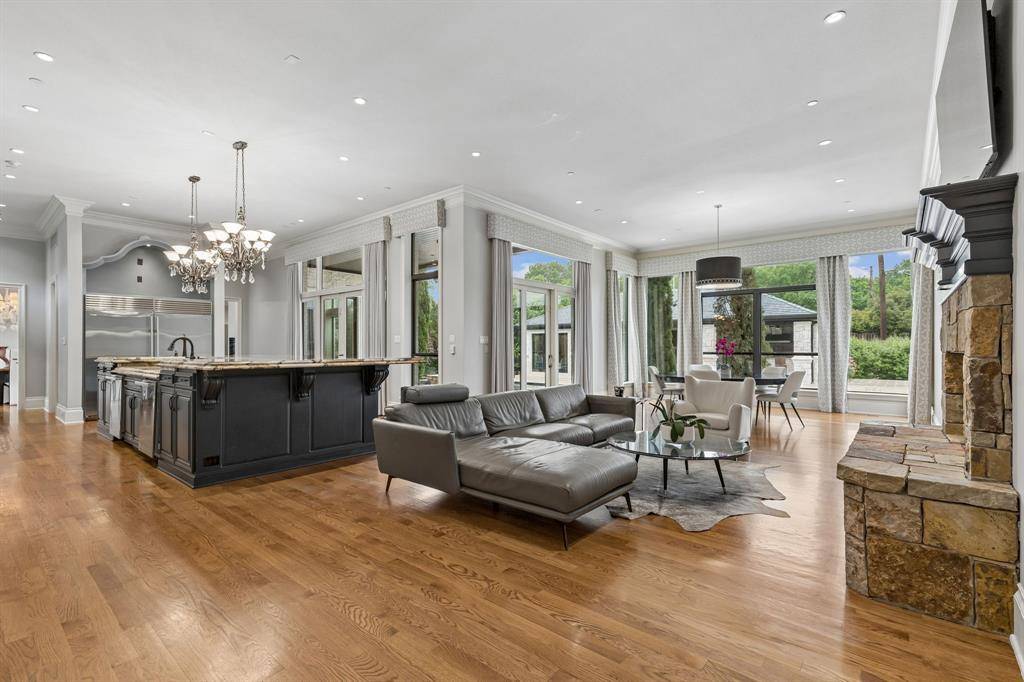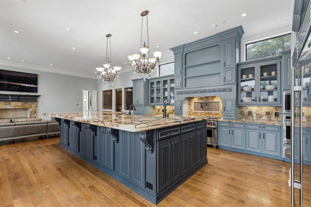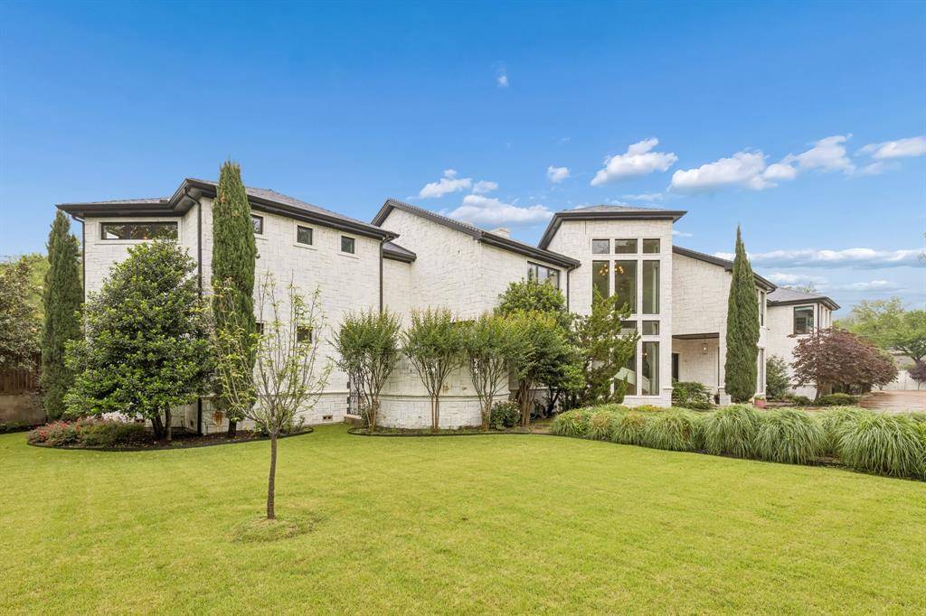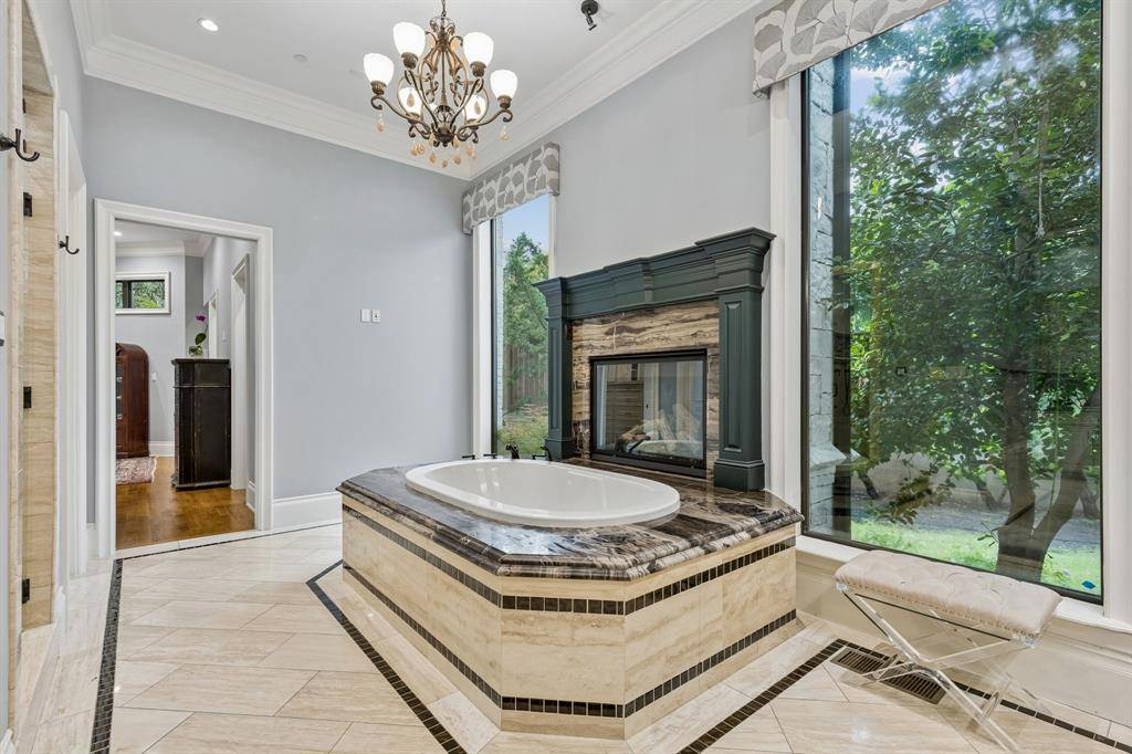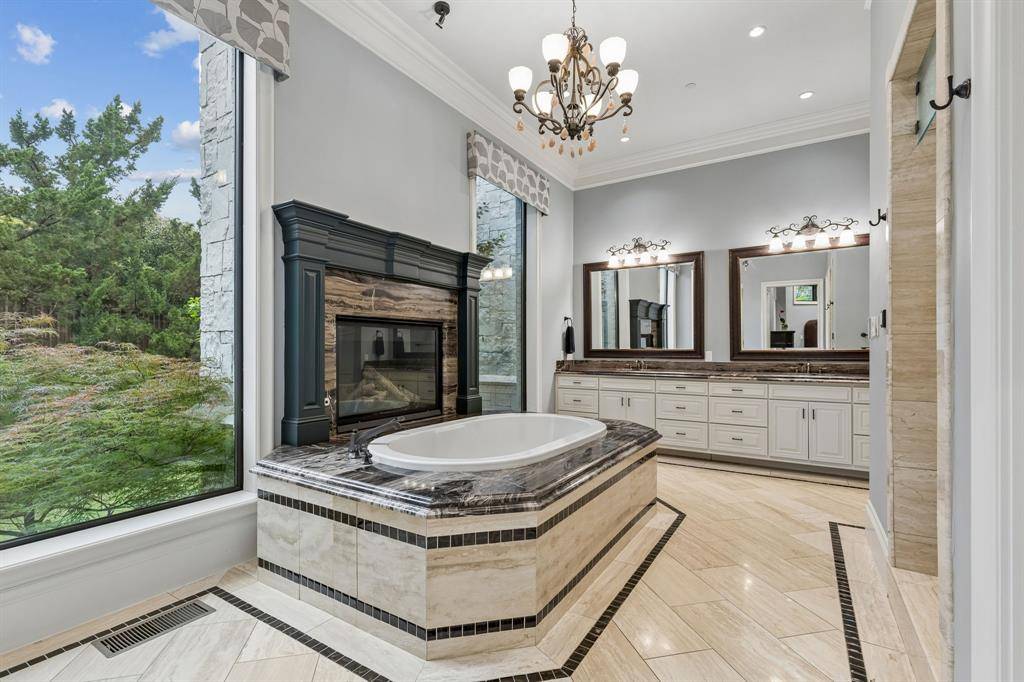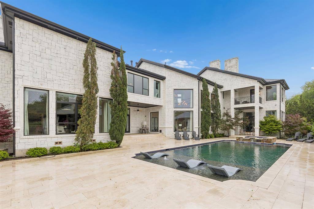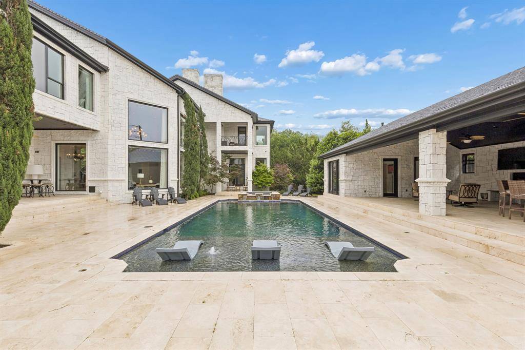 Set on a beautifully landscaped acre in coveted Bluffview, this elegant estate pairs timeless architecture with refined modern comfort, creating an exceptional indoor-outdoor lifestyle. A dramatic marble entry with soaring 25-foot ceilings and a sweeping staircase sets the tone, opening to expansive, light-filled living spaces designed for both everyday living and entertaining. At the heart of the home, the chef's kitchen is anchored by an impressive 15-by-7-foot marble island with seating for ten. Outfitted with Wolf appliances, dual dishwashers, a butler's pantry, and a custom walk-in wine room, it flows effortlessly into the surrounding living and dining areas, all of which open to the main patio. The private primary wing offers a peaceful retreat, complete with two fireplaces, a sitting area, morning bar, and direct access to a secluded patio with a newly built gas fire feature. A spiral staircase leads to a dedicated second level with four oversized walk-in closets, while the suite also includes private laundry and a flexible bonus space nearby. Each additional bedroom is generously sized and accompanied with its own en-suite bath and walk-in closet. Upstairs, a spacious family and game room with a full kitchen is complemented by a theater room, craft space, additional laundry, and elevator access. A gorgeous, oversized office provides the ultimate work-from-home environment, featuring a built-in library, dual work areas, a central lounge with fireplace, and a private patio. Outdoors, the grounds rival a private resort, showcasing a stunning pool and spa, professional landscaping, a striking crescent-shaped gas fire feature, and a fully equipped outdoor kitchen. A 969-square-foot guest house with a bath adds flexibility for visitors or extended stays. With eight fireplaces throughout, the home is layered with warmth and ambiance. A true Bluffview lifestyle estate, thoughtfully designed for elevated living, comfort, and unforgettable entertaining.