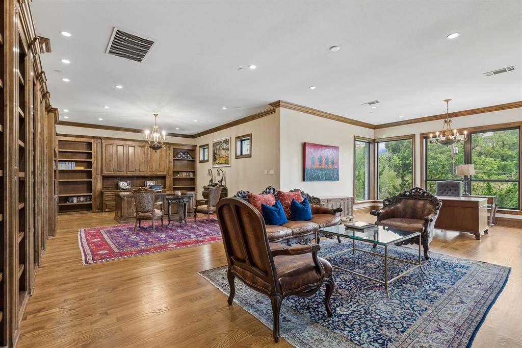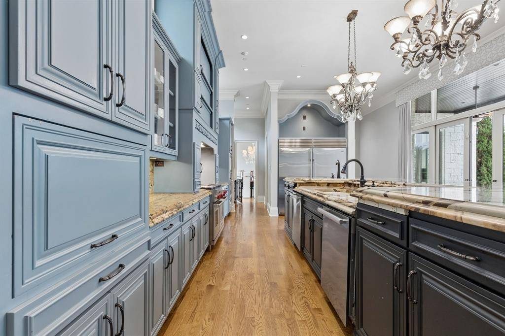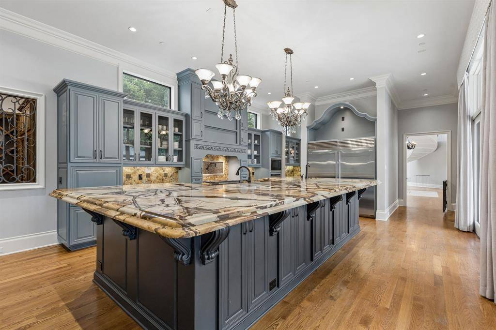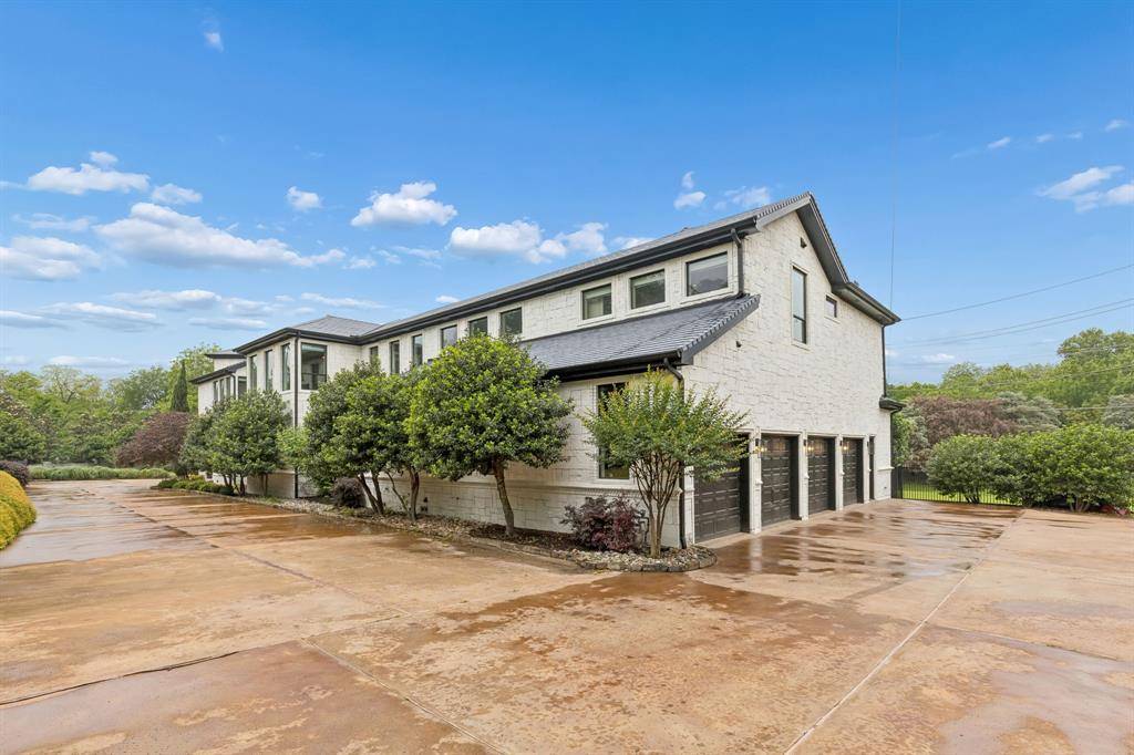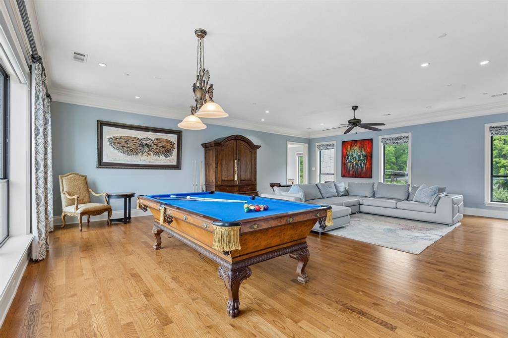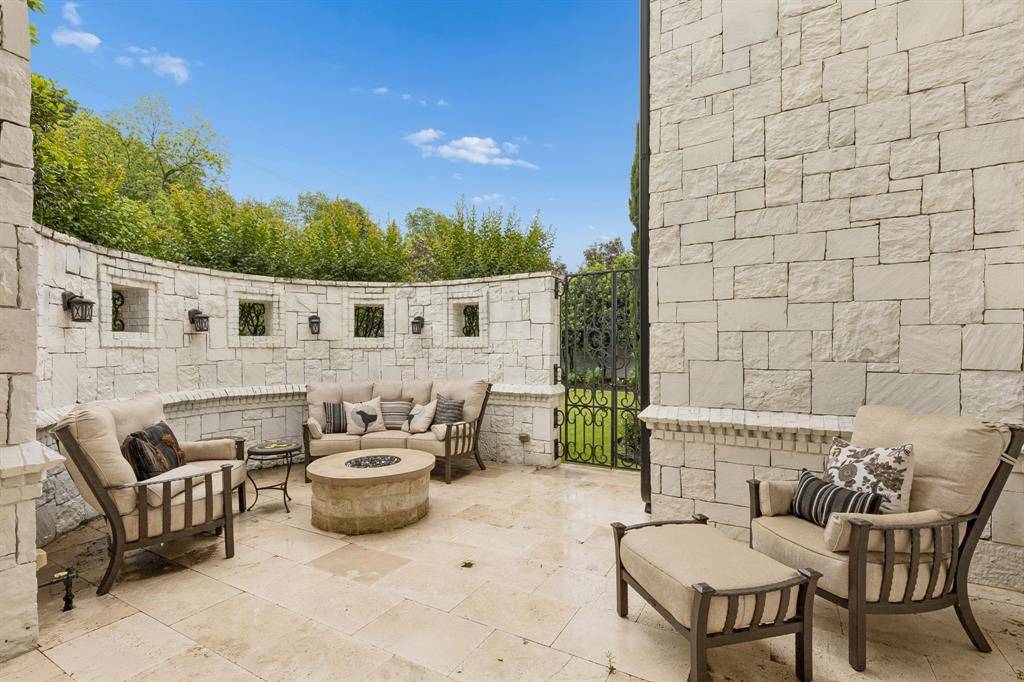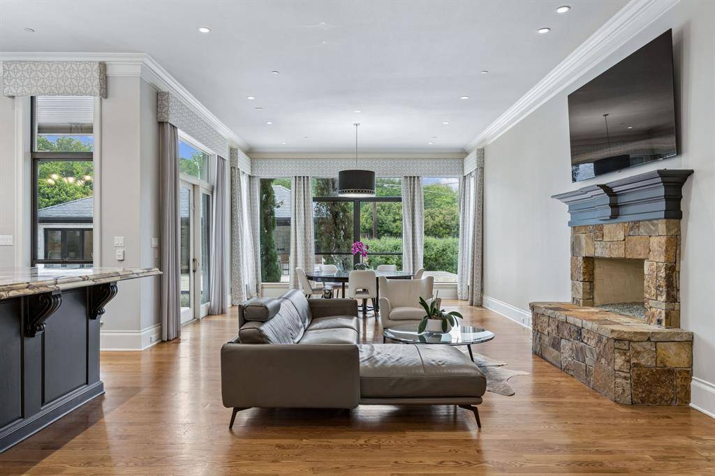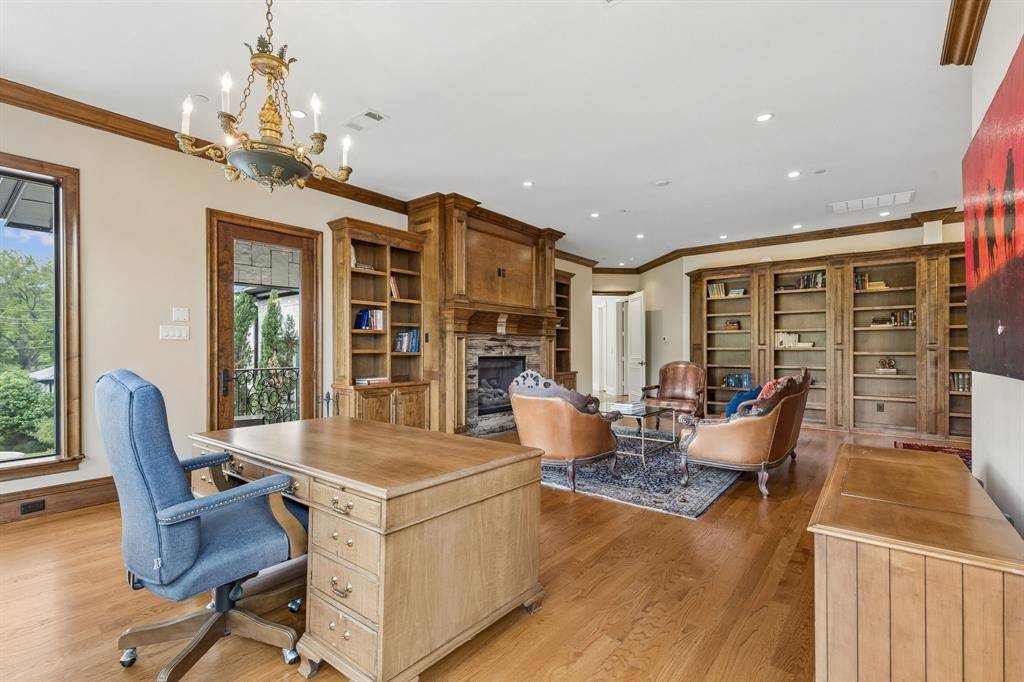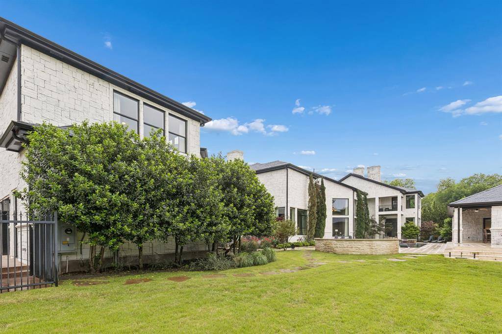 Set on a beautifully landscaped acre in coveted Bluffview, this elegant estate pairs timeless architecture with refined modern comfort, creating an exceptional indoor-outdoor lifestyle. A dramatic marble entry with soaring 25-foot ceilings and a sweeping staircase sets the tone, opening to expansive, light-filled living spaces designed for both everyday living and entertaining. At the heart of the home, the chef's kitchen is anchored by an impressive 15-by-7-foot marble island with seating for ten. Outfitted with Wolf appliances, dual dishwashers, a butler's pantry, and a custom walk-in wine room, it flows effortlessly into the surrounding living and dining areas, all of which open to the main patio. The private primary wing offers a peaceful retreat, complete with two fireplaces, a sitting area, morning bar, and direct access to a secluded patio with a newly built gas fire feature. A spiral staircase leads to a dedicated second level with four oversized walk-in closets, while the suite also includes private laundry and a flexible bonus space nearby. Each additional bedroom is generously sized and accompanied with its own en-suite bath and walk-in closet. Upstairs, a spacious family and game room with a full kitchen is complemented by a theater room, craft space, additional laundry, and elevator access. A gorgeous, oversized office provides the ultimate work-from-home environment, featuring a built-in library, dual work areas, a central lounge with fireplace, and a private patio. Outdoors, the grounds rival a private resort, showcasing a stunning pool and spa, professional landscaping, a striking crescent-shaped gas fire feature, and a fully equipped outdoor kitchen. A 969-square-foot guest house with a bath adds flexibility for visitors or extended stays. With eight fireplaces throughout, the home is layered with warmth and ambiance. A true Bluffview lifestyle estate, thoughtfully designed for elevated living, comfort, and unforgettable entertaining.