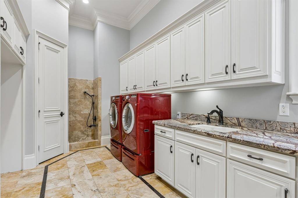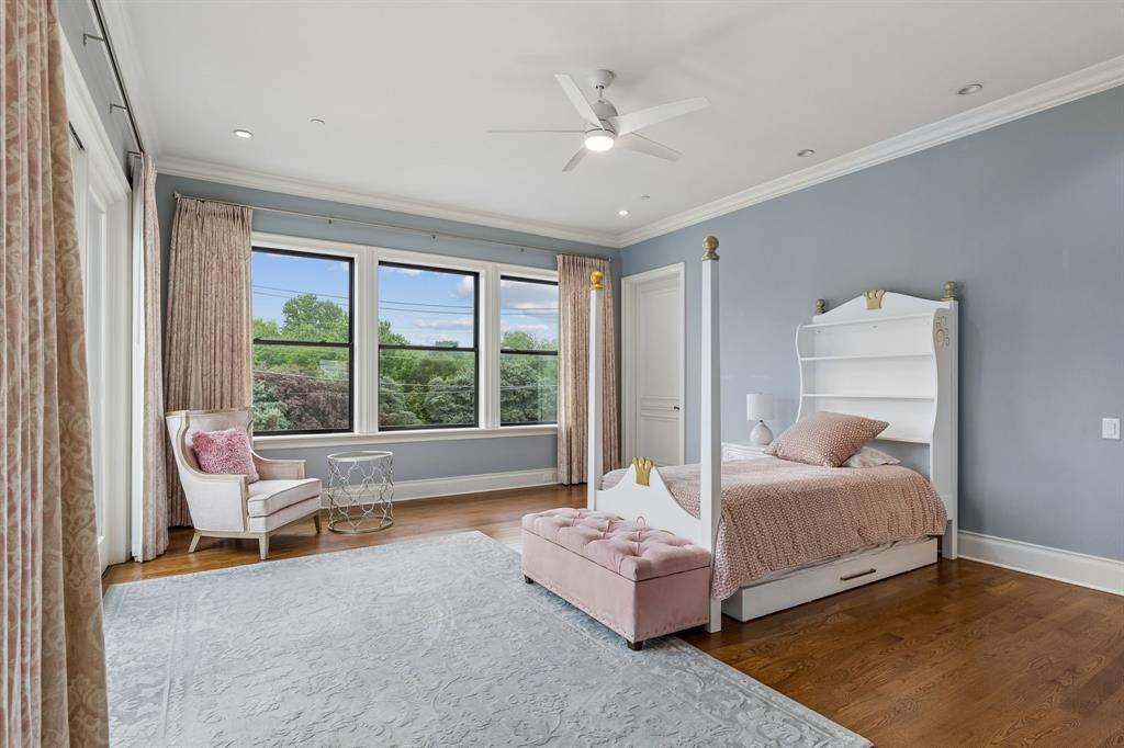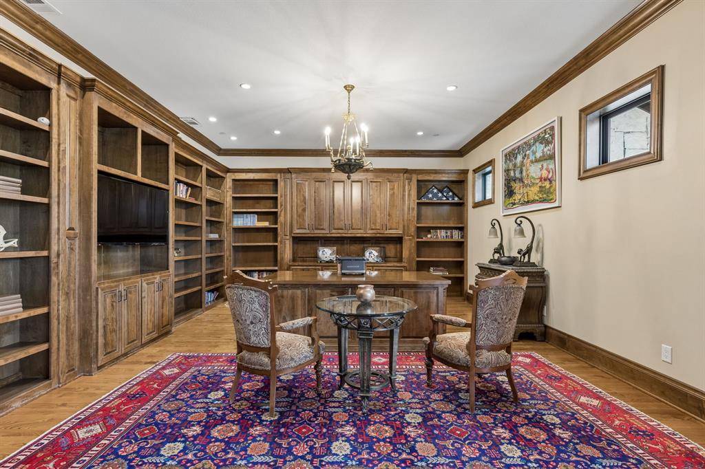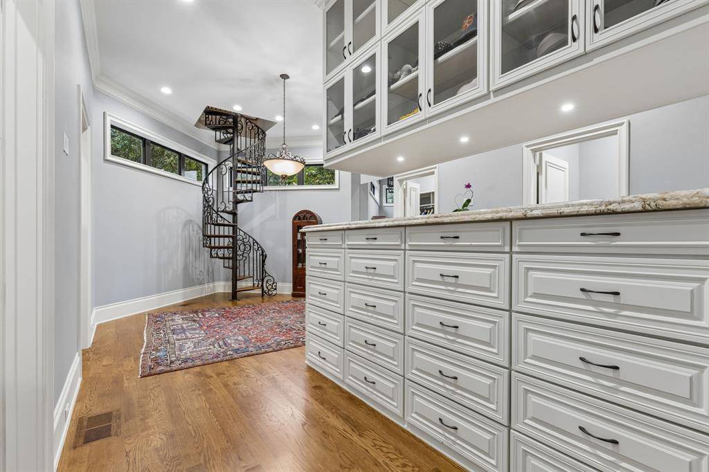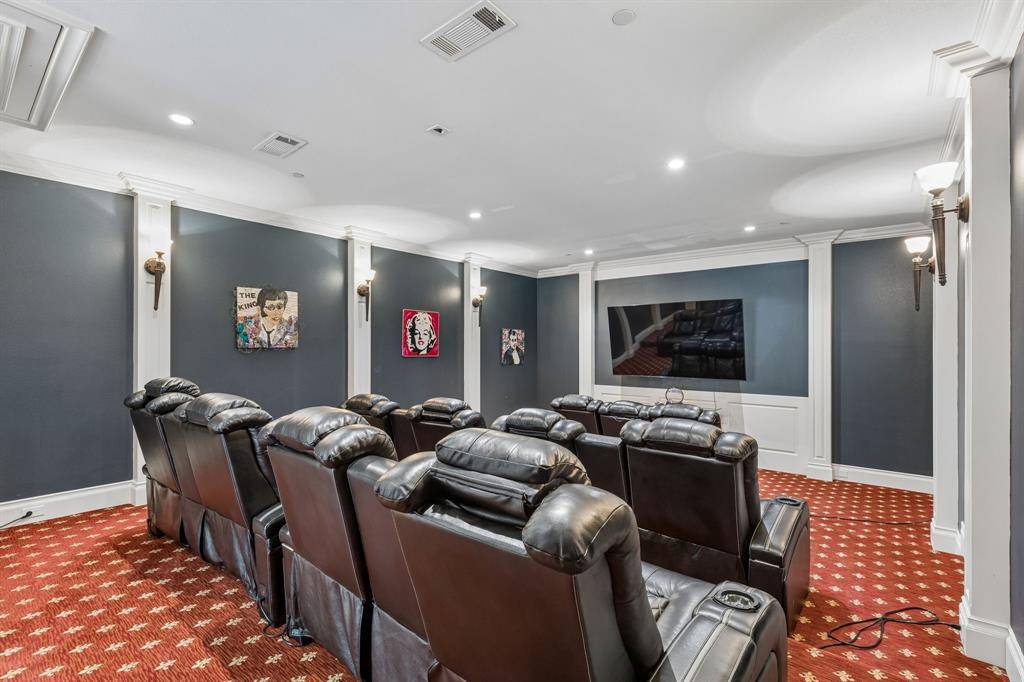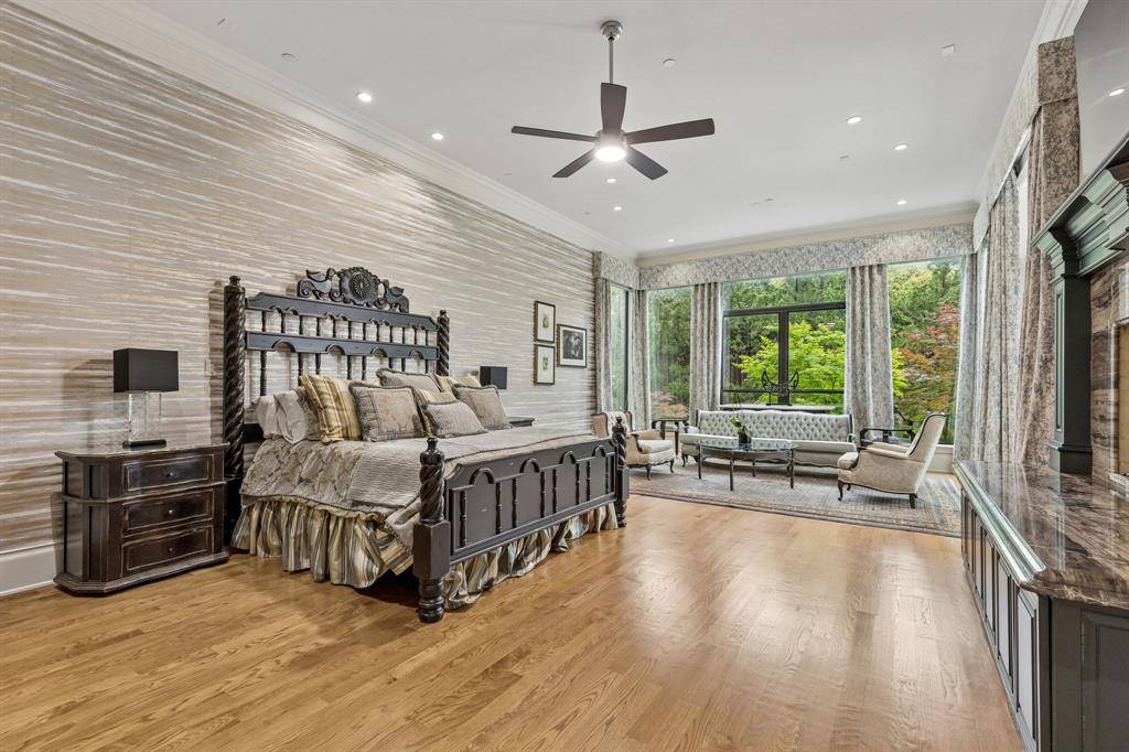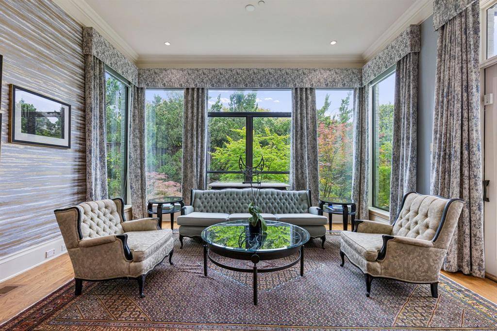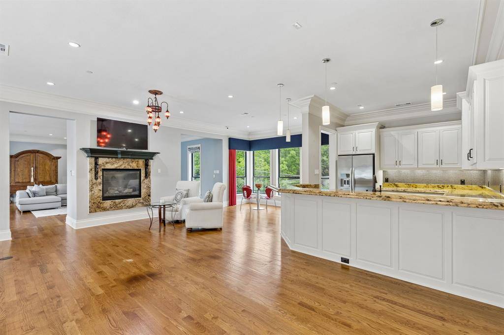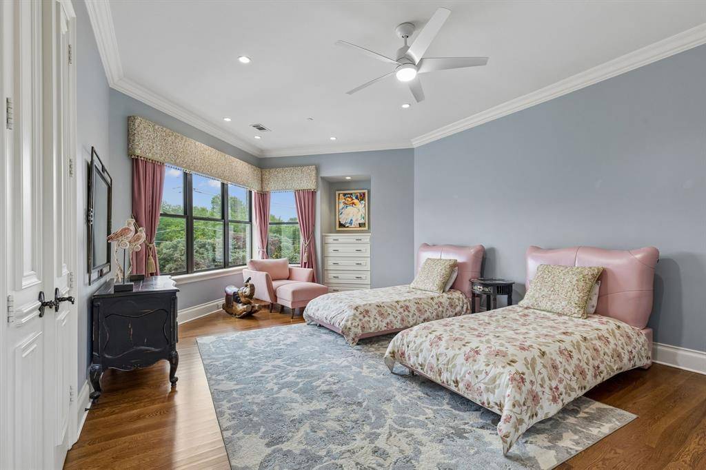 Set on a beautifully landscaped acre in coveted Bluffview, this elegant estate pairs timeless architecture with refined modern comfort, creating an exceptional indoor-outdoor lifestyle. A dramatic marble entry with soaring 25-foot ceilings and a sweeping staircase sets the tone, opening to expansive, light-filled living spaces designed for both everyday living and entertaining. At the heart of the home, the chef's kitchen is anchored by an impressive 15-by-7-foot marble island with seating for ten. Outfitted with Wolf appliances, dual dishwashers, a butler's pantry, and a custom walk-in wine room, it flows effortlessly into the surrounding living and dining areas, all of which open to the main patio. The private primary wing offers a peaceful retreat, complete with two fireplaces, a sitting area, morning bar, and direct access to a secluded patio with a newly built gas fire feature. A spiral staircase leads to a dedicated second level with four oversized walk-in closets, while the suite also includes private laundry and a flexible bonus space nearby. Each additional bedroom is generously sized and accompanied with its own en-suite bath and walk-in closet. Upstairs, a spacious family and game room with a full kitchen is complemented by a theater room, craft space, additional laundry, and elevator access. A gorgeous, oversized office provides the ultimate work-from-home environment, featuring a built-in library, dual work areas, a central lounge with fireplace, and a private patio. Outdoors, the grounds rival a private resort, showcasing a stunning pool and spa, professional landscaping, a striking crescent-shaped gas fire feature, and a fully equipped outdoor kitchen. A 969-square-foot guest house with a bath adds flexibility for visitors or extended stays. With eight fireplaces throughout, the home is layered with warmth and ambiance. A true Bluffview lifestyle estate, thoughtfully designed for elevated living, comfort, and unforgettable entertaining.