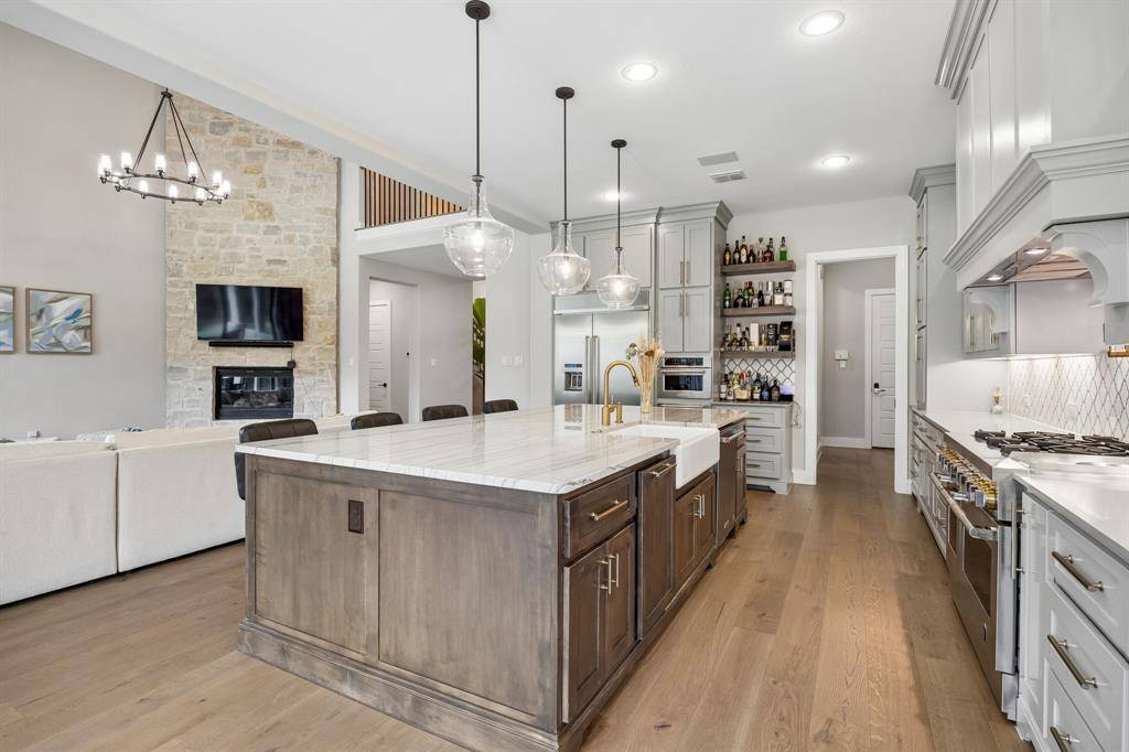 The chef's kitchen is both beautiful and highly functional, showcasing custom cabinetry, quartz and quartzite countertops, a marble backsplash, and an oversized alder island. Premium appliances include a 48-inch JennAir dual fuel range, built-in KitchenAid refrigerator, warming drawer, microwave, and custom vent hood, all complemented by a large walk-in pantry and under-cabinet lighting.