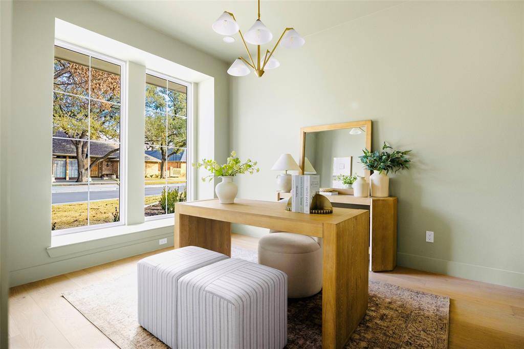 Designed for the way people truly live, the floor plan offers both flexibility and flow. Two distinct living areas create space to gather, work, or unwind, while expansive windows draw in natural light and create a quiet connection to the outdoors. The home's layout centers around the backyard, with four bedrooms — including one currently styled as an office — and three full baths arranged to capture views of the patio and pool from many of the main living spaces.
