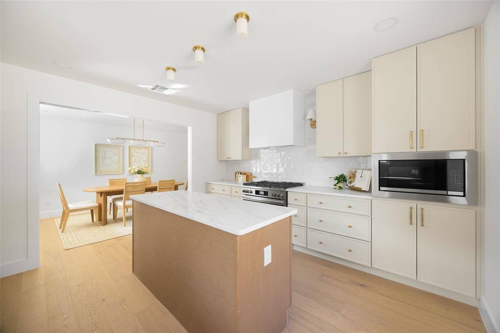 Completed in 2025 by Maverick Design and Wedgewood Homes, the renovation reflects a cohesive, design-forward approach. At the center of the home, the kitchen anchors daily life and entertaining with light cabinetry, a bespoke vent hood, and a 6-burner gas range. The adjacent dining space is equally suited for everyday meals or larger gatherings, complemented by a built-in buffet that adds both function and architectural presence.
