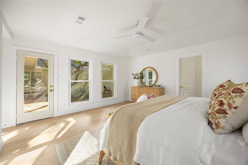 The primary suite offers a more private retreat, with a reading nook, a spa-inspired bath, and direct access to the patio — an easy extension of the home for morning coffee or quiet evenings.
