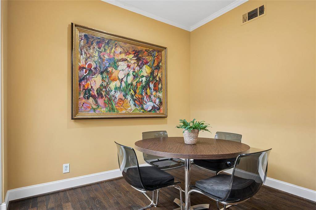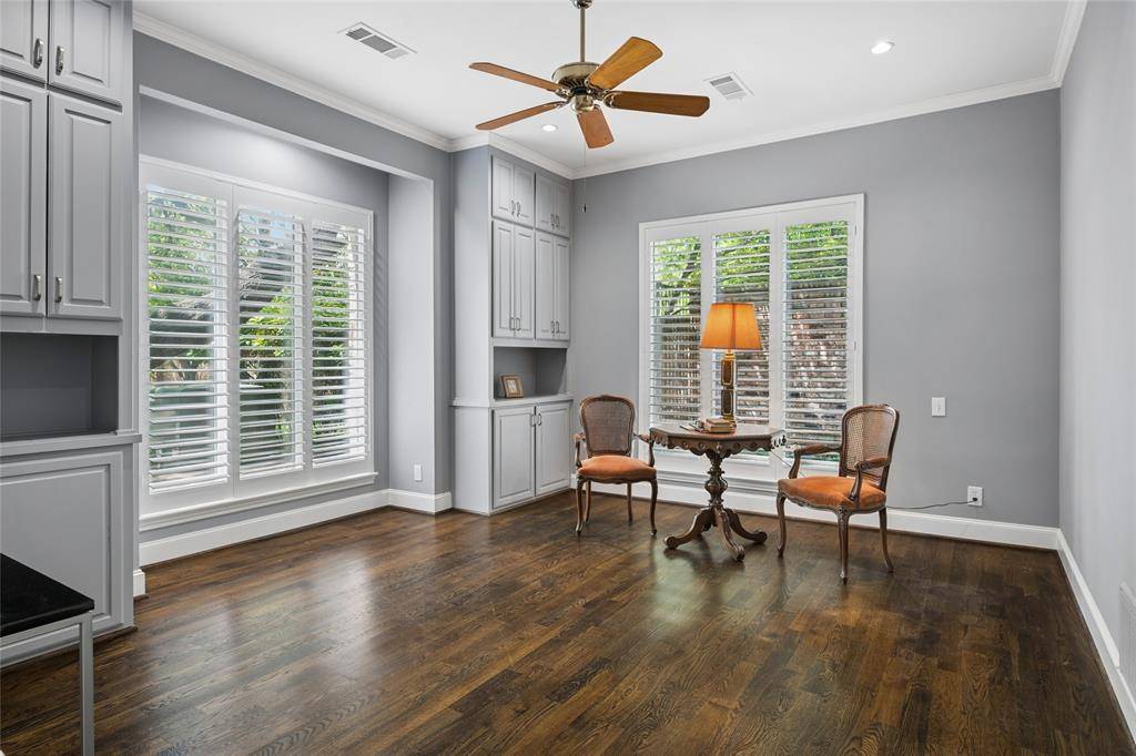 Formal dining easily accommodates 12–14 guests and overlooks a serene private courtyard and fountain, creating an elegant backdrop for memorable gatherings. An inviting living room is anchored by a large fireplace equipped with gas logs and a cozy den with two built-in bookcases and cabinets overlooks the shaded front garden, creating a peaceful space to read or relax. Adjoining the garage is a spacious utility room with sink plus a pantry for cleaning supplies and equipment. East and West gated courtyards provide additional outdoor living spaces, each enhanced by beautiful fountains, reinforce the home's privacy and refined luxury.
