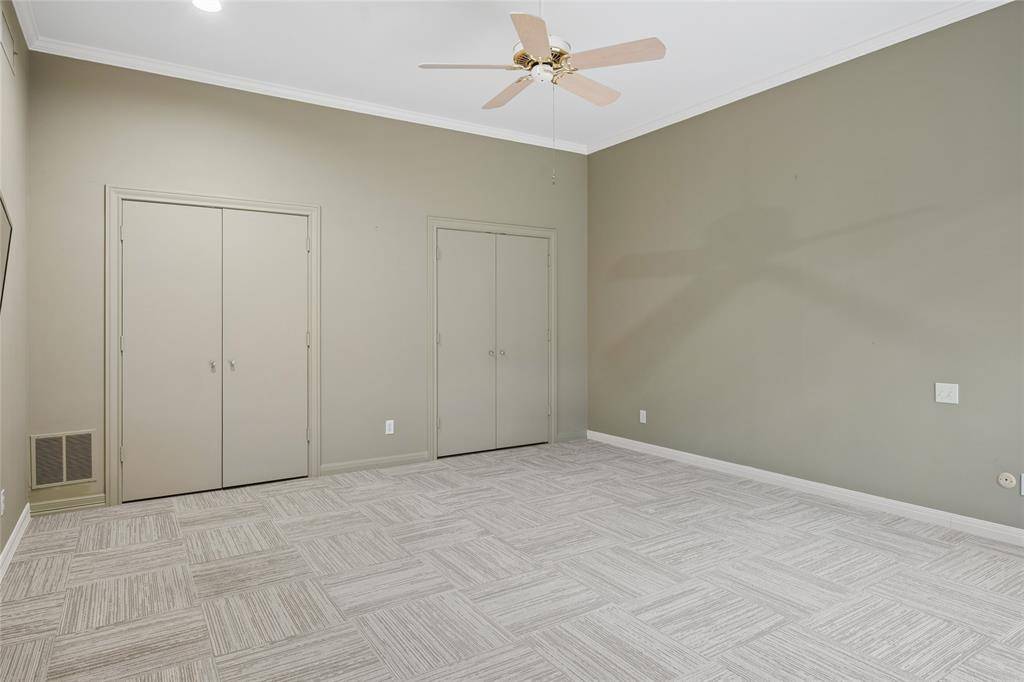 The primary suite offers a true retreat, complete with dual baths and direct access to a private patio with swing and tranquil fountain. A split, private guest suite provides comfort and flexibility, featuring two closets, plush carpeting, and a quiet, secluded setting ideal for visitors' extended stays.